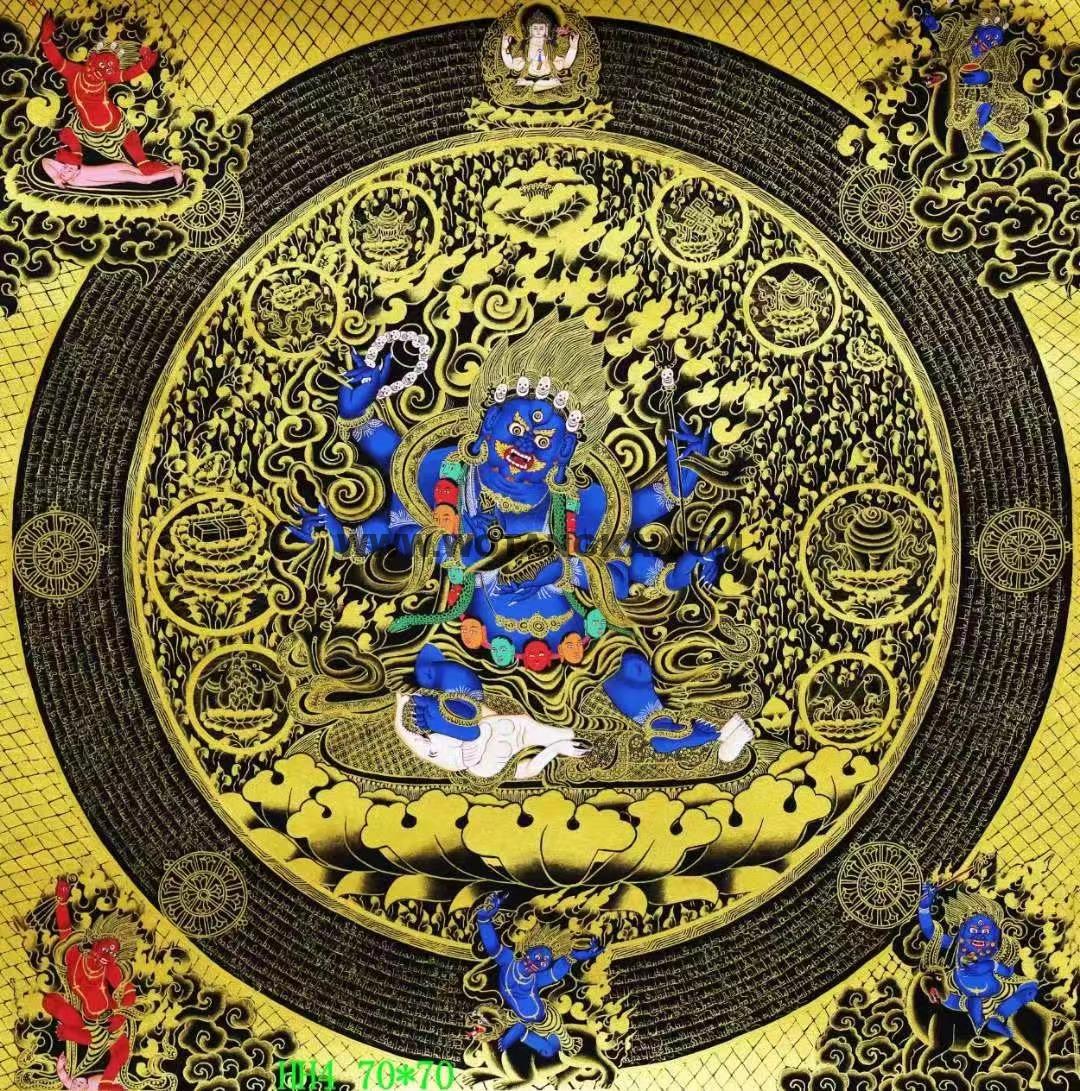 玛哈嘎拉是梵语,译为大黑天,即”怙主”之意,为上师、本尊、护法三根本之护法神,是佛教三根本的化身。其为调伏刚强众生而呈现忿怒相,本尊及眷属护法众除护持佛法外,依缘起多示现为两臂、四臂、六臂黑、白等形象,为藏传佛教诸宗共同推崇的智慧护法,是藏传佛教中最重要的护法神之一。