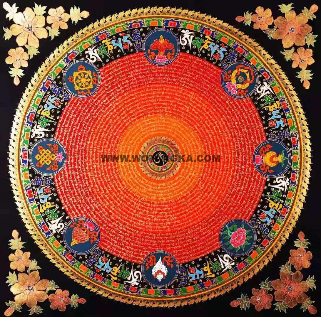 吉祥八宝六字真言经文坛城唐卡 【吉祥八宝坛城】曼陀罗,唐卡手绘布本。作品采用金粉混合天然颜料纯手绘而成,画工细腻,精致,精品不要错过。