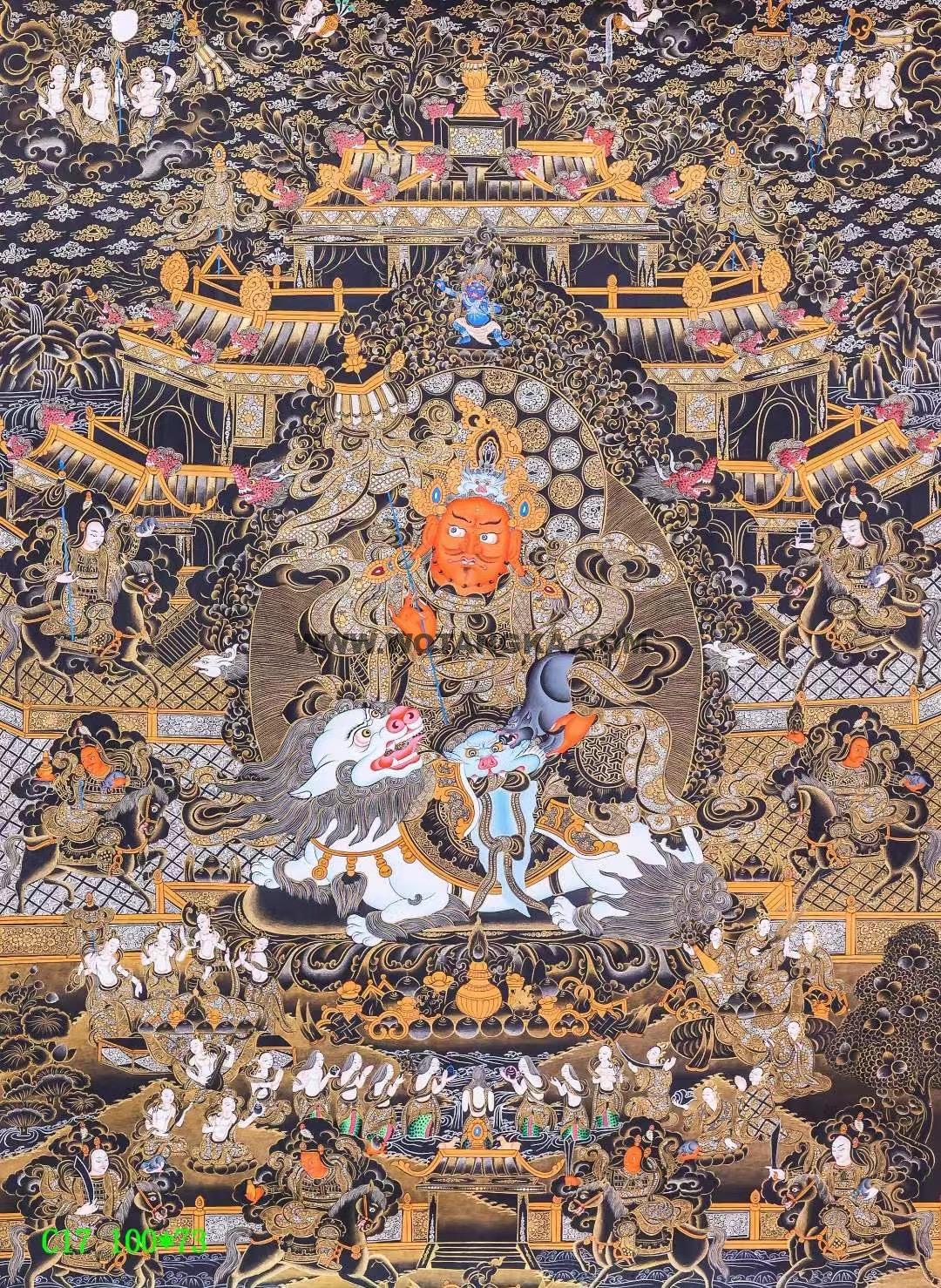尼泊尔知名唐卡大师力作《财宝天王·八马财神》 唐卡手绘布本,底色为天然矿物颜料研磨沁色晕染,其余色彩均为天染矿物颜料绘制,24K金描金,整幅唐卡画工极为精湛,主尊财宝天王度量经准确无误,法相殊胜传神,头光部分金线绘制尤为细腻,精美绝伦,堪称神来之笔!其余细节部分处理无不体现大师对于艺术的极致追求,这是一幅值得珍藏的唐卡。