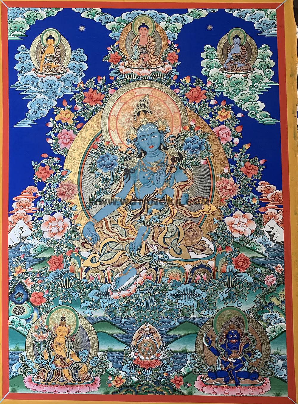中国唐卡艺术作品中的【绿度母】唐卡手绘布本,热贡知名画师完德才让·画院出品,收藏供奉不要错过。作品主尊宝相传神, 采用天然矿石晕染,纯金描线,画工细腻,殊胜,精美、风格富丽,采用24K真金描绘,画工细腻,开脸殊胜,是一副难得一见的好唐卡作品。