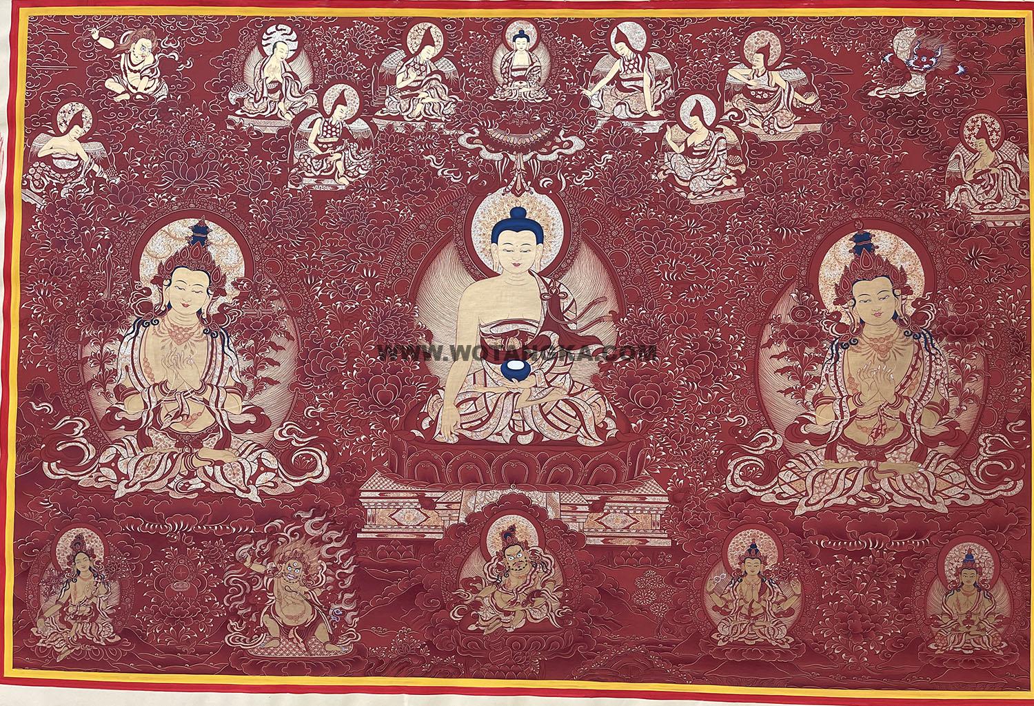中国唐卡艺术作品中的【释迦牟尼佛·华严三圣】唐卡手绘布本,热贡知名画师东智加·画院出品,收藏供奉不要错过。作品主尊宝相传神, 采用天然矿石晕染,纯金描线,画工细腻,殊胜,精美、风格富丽,采用24K真金描绘,画工细腻,开脸殊胜,是一副难得一见的好唐卡作品。
