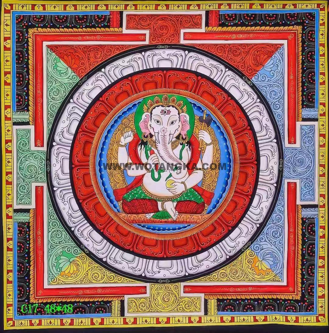 尼泊尔知名喇嘛手绘力作唐卡【象头财神坛城】,主尊宝相传神,作品采用24K真金描线,天然矿石颜料着色晕染,画工细腻,开脸殊胜,是一副难得一见的好唐卡作品。