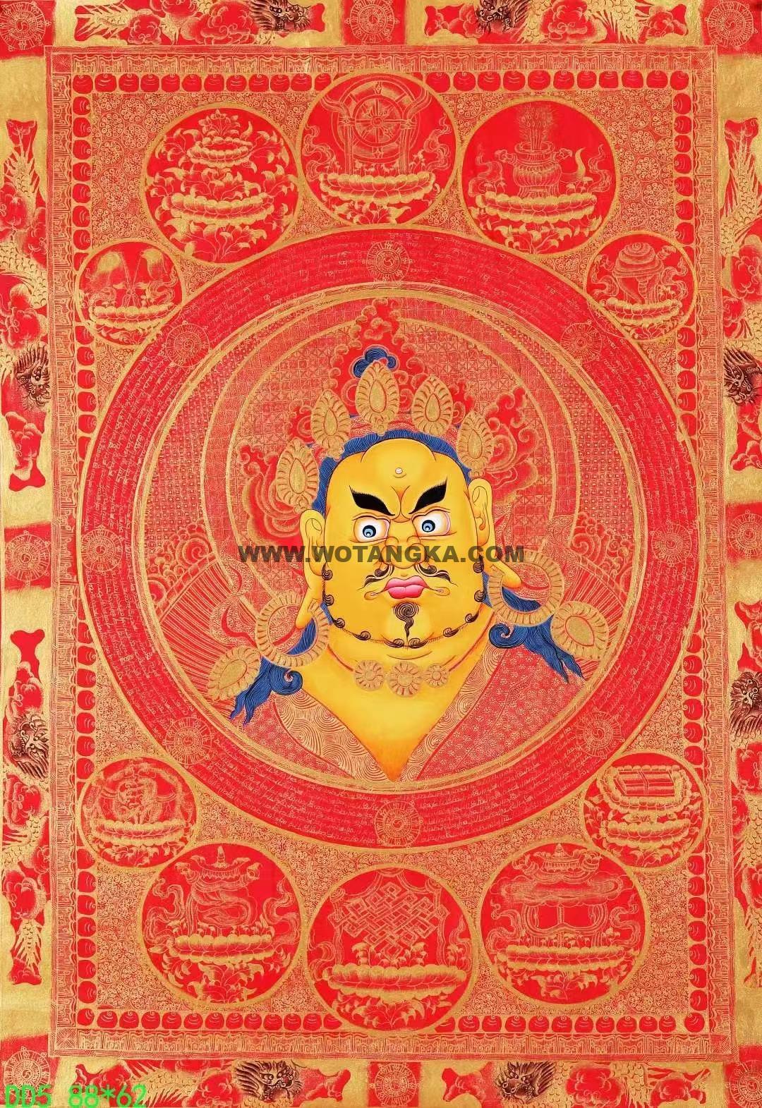 尼泊尔国宝级知名画僧那噶王(Nawang Lama)亲绘,《黄财神佛头》唐卡由那噶王(Nawang Lama)喇嘛签名。 画工精美细腻,金线如发丝,晕染和描金相当的完美,难得的高品质精品唐卡,值得收藏的经典之作。 采用24K真金描线,天然矿石颜料着色晕染。画工细腻,开脸殊胜,是一副难得一见的好唐卡。