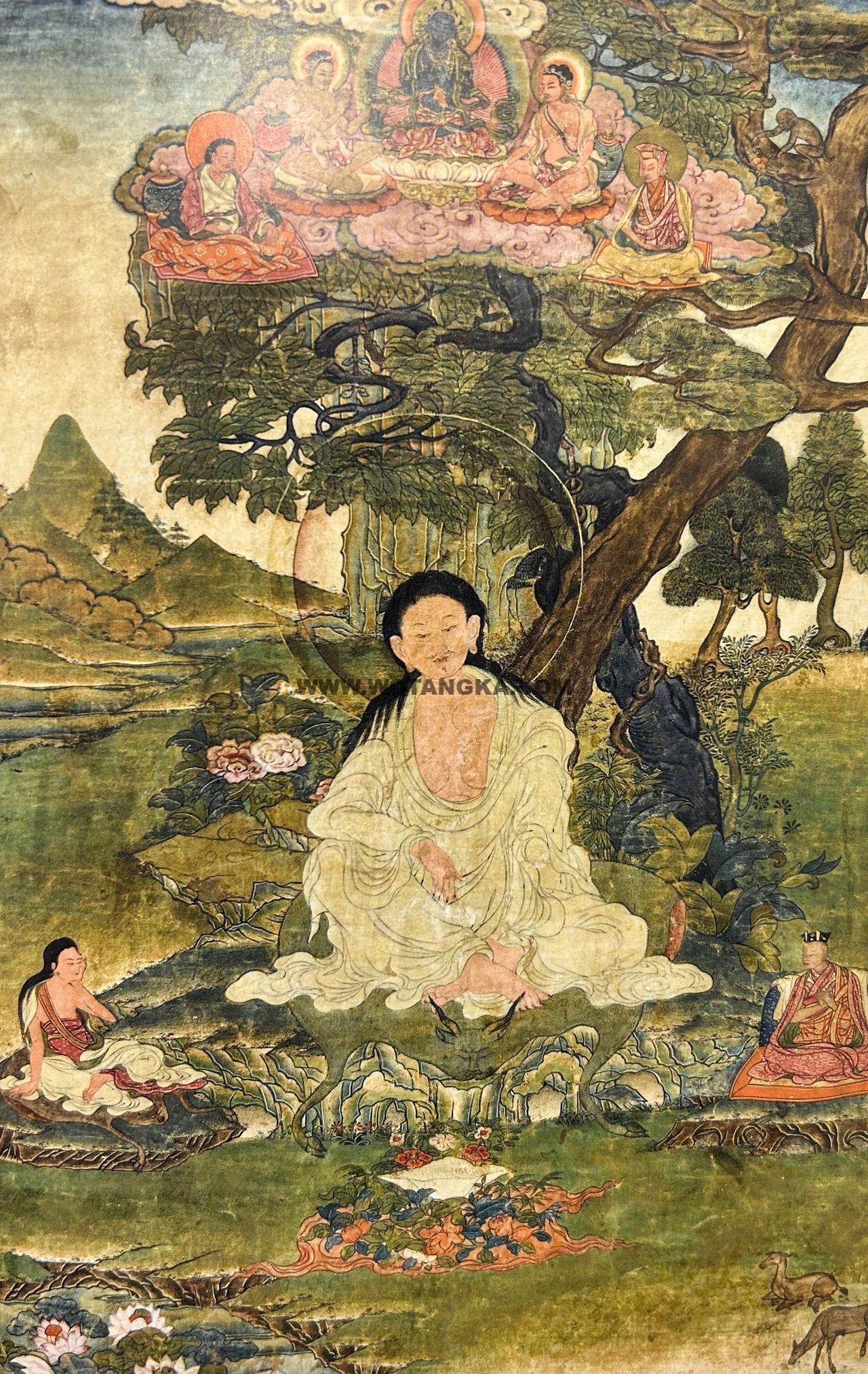唐卡中暖色调的运用调和了背景中青绿基调的山石树木清冷色调,令画面整体呈现出和谐、高级之感。风景中的山石、树木、湖泊相较于早期唐卡更为写实,更偏向汉地的山水画法。人物形象比例准确,五官描绘清晰细腻,特别是几个瑜伽士装扮的人物形象,体态修长优美富于韵律。画作中韵含着无限诗意与淡远意境,是18世纪噶玛嘎赤画派不可多得的精品画作。