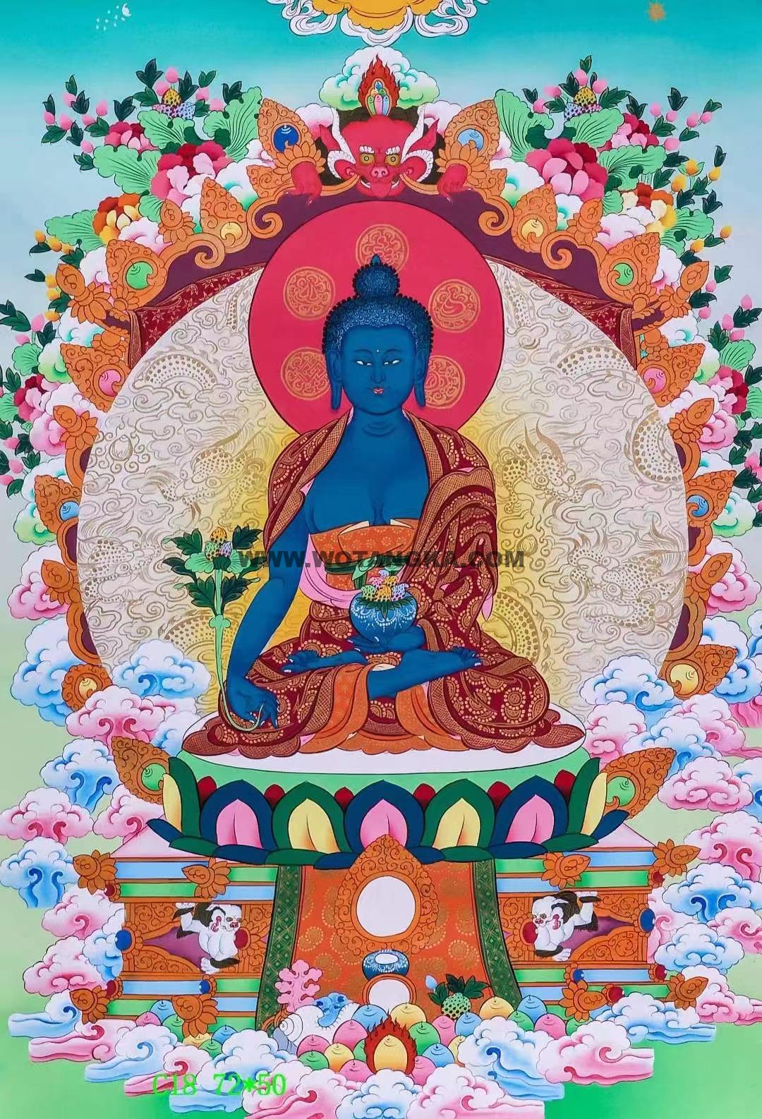 尼泊尔知名唐卡画师作品《药师佛》,作品采用24K真金描线,混合天然颜料纯手绘而成。作品主尊宝相传神,布图干净精美、画工非常的细腻,严格的遵照佛经的度量仪轨如法绘制,期待有缘人。