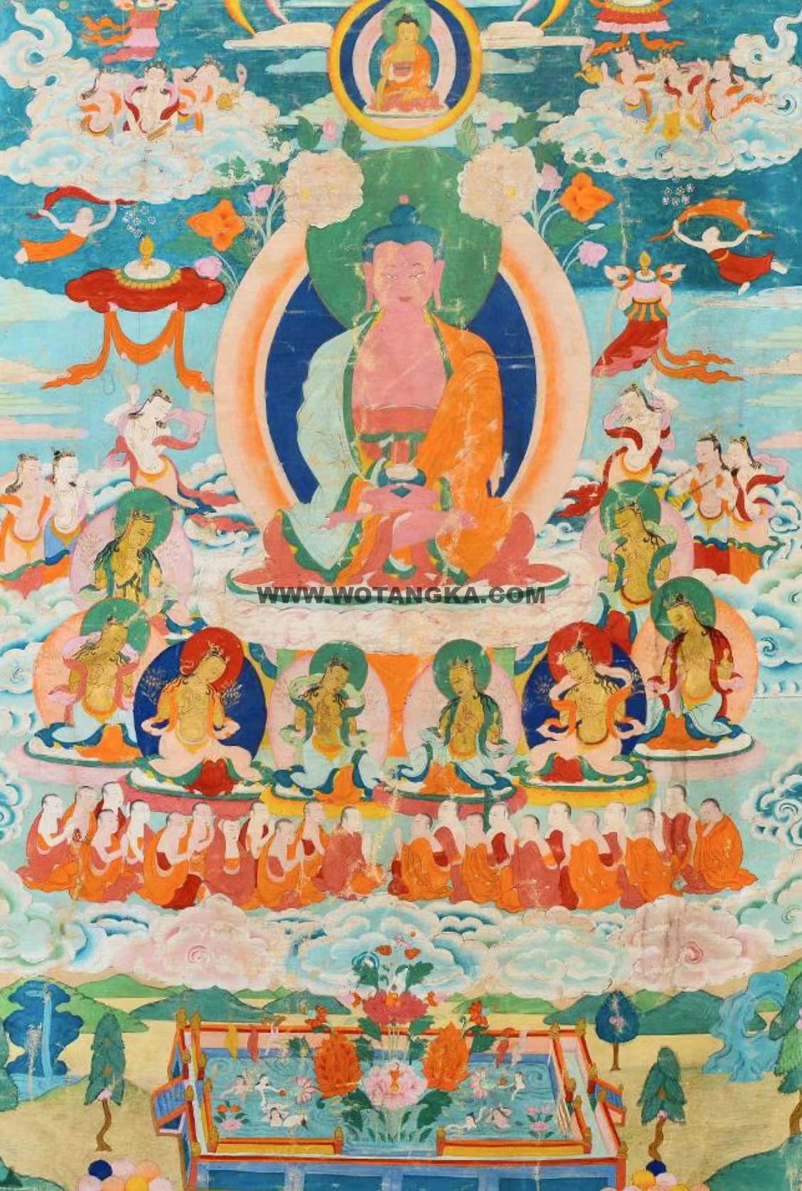 历来的壁画、造型和唐卡都是能工巧匠们穷尽毕生技艺塑造出最美好的佛、菩萨形象。我们来细看一下唐卡,中间是阿弥陀佛,其双腿结跏趺端坐于莲花台座之上,身红色,饰蓝色螺发,高肉髻,面相圆润,身着桔红色袈裟,双手结禅定印于腹前、并托钵,形象庄严慈祥!天空以蓝色填满,天界有释迦牟尼佛和手持礼器的各位供养菩萨和协侍菩萨,佛前有八大菩萨围坐听法,下面为众多僧众,他们虔诚的看向主尊,表达内心的景仰,最下面还有戏水的场景,一派欢乐祥和之象,也就是我们常说的西方极乐世界。