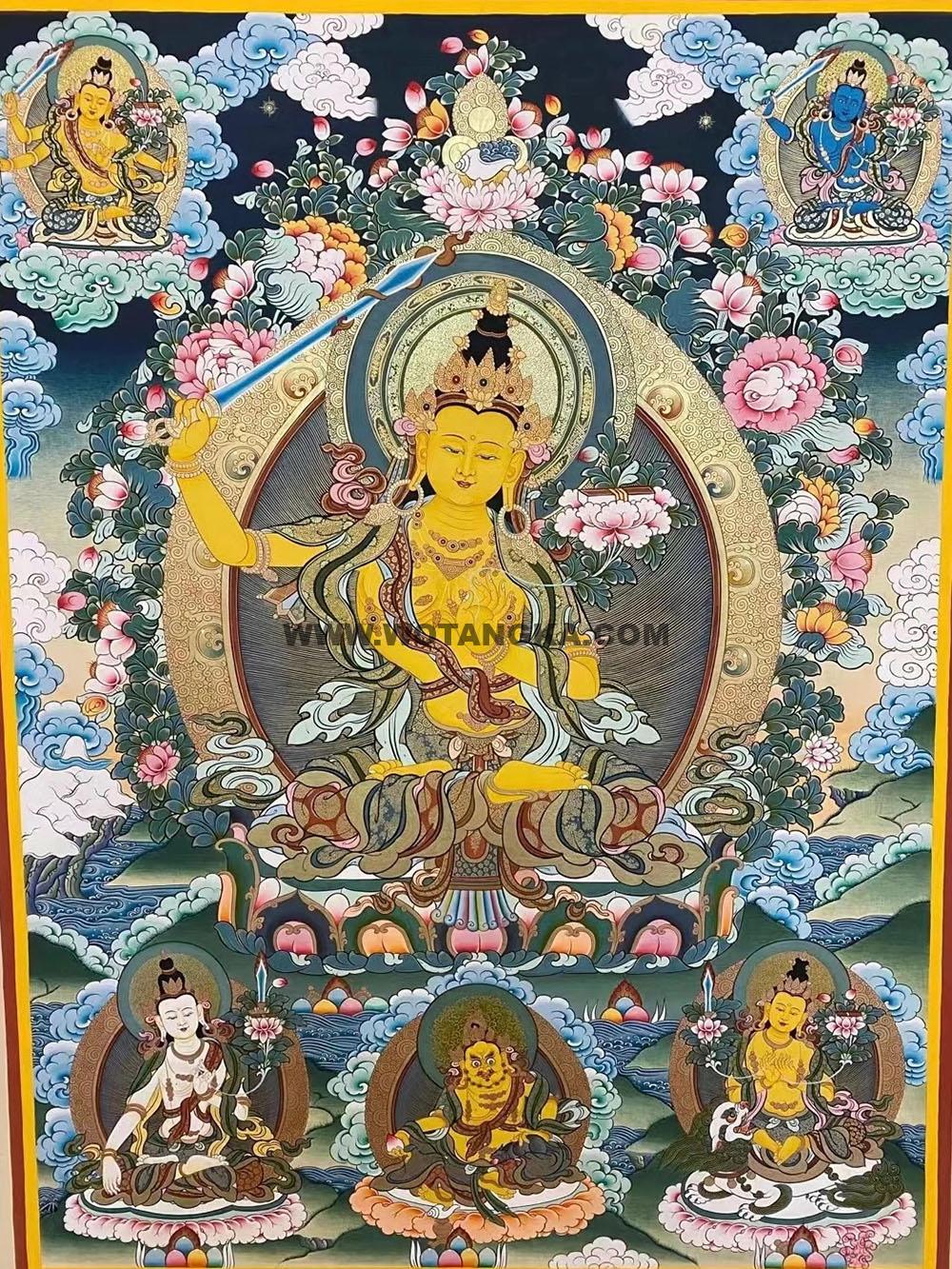 中国唐卡艺术作品中的【文殊菩萨·五部文殊】唐卡手绘布本,热贡知名画师多杰扎西·画院出品,收藏供奉不要错过。作品主尊宝相传神, 采用天然矿石晕染,纯金描线,画工细腻,殊胜,精美、风格富丽,采用24K真金描绘,画工细腻,开脸殊胜,是一副难得一见的好唐卡作品。