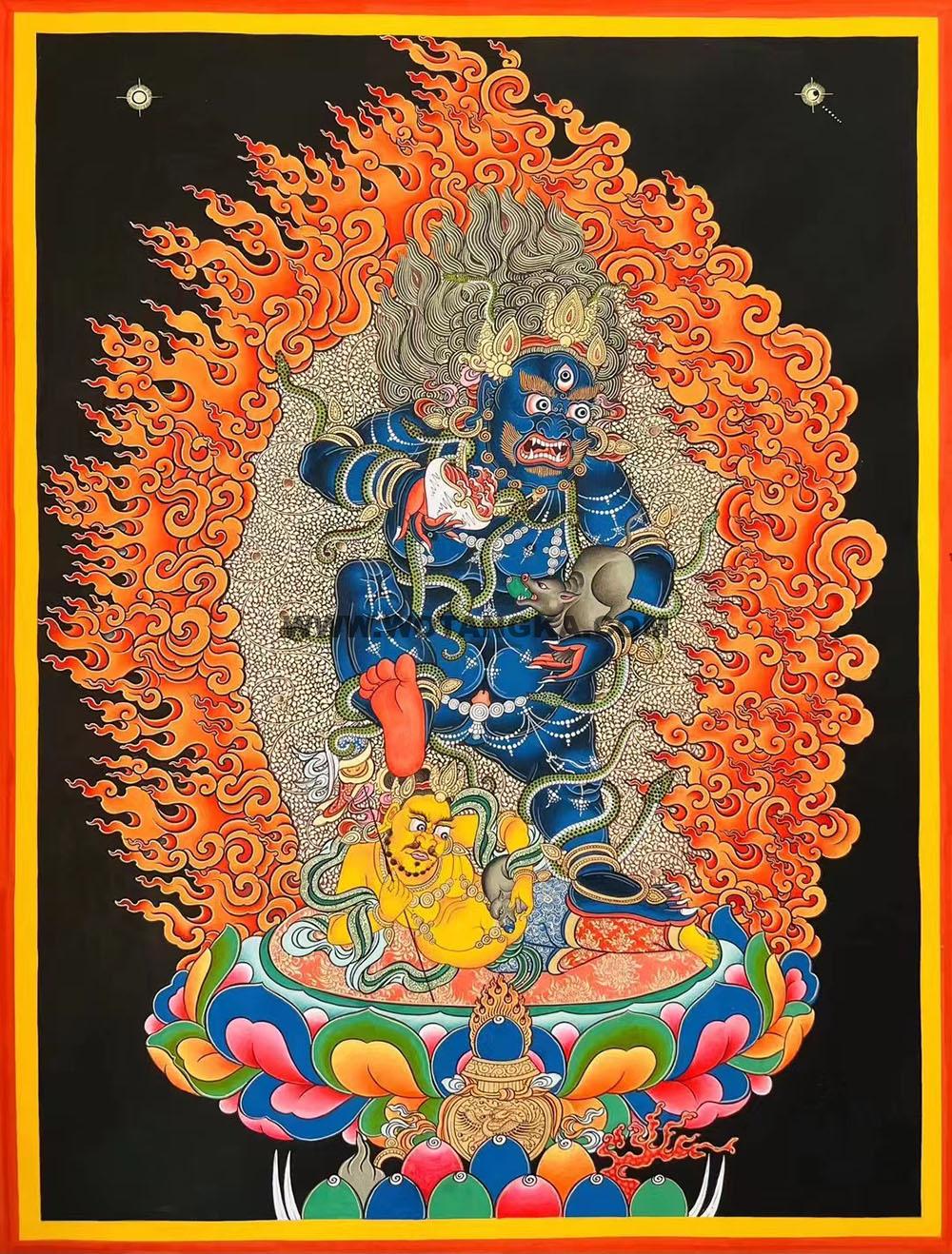 黑财神藏名“藏拉那波”,乃是东方佛里的金刚不动佛。为了利益娑婆众生解脱穷困之苦而化现,在密宗认为,黑财神是五姓财神中施财立即见效的财神,甚至称他为财神王。黑财神乃是五方佛之东方金刚不动佛,为利益娑婆众生摆脱穷困的苦恼所做的化现。 身青黑色,故名。主要功德为驱除所有违缘的纠缠,并使一切善愿都能心想事成,圆满无碍。 此尊身形矮胖,大肚福相,红发黑肤裸体,三目圆睁,发须眉赤红如火,头戴宝冠,以珠宝璎珞、以八龙王为饰,生殖器上竖,辉光靠背,粗体大腹,右手擎盈血颅器于胸,左手捉吐宝鼠,两足以右曲左伸姿威立, 踏于黄色持财天之背,安住莲花月轮座上。修持黑财神法门,可获其庇佑,消除怨敌、偷盗、病魔等障,使诸受用财富增长。