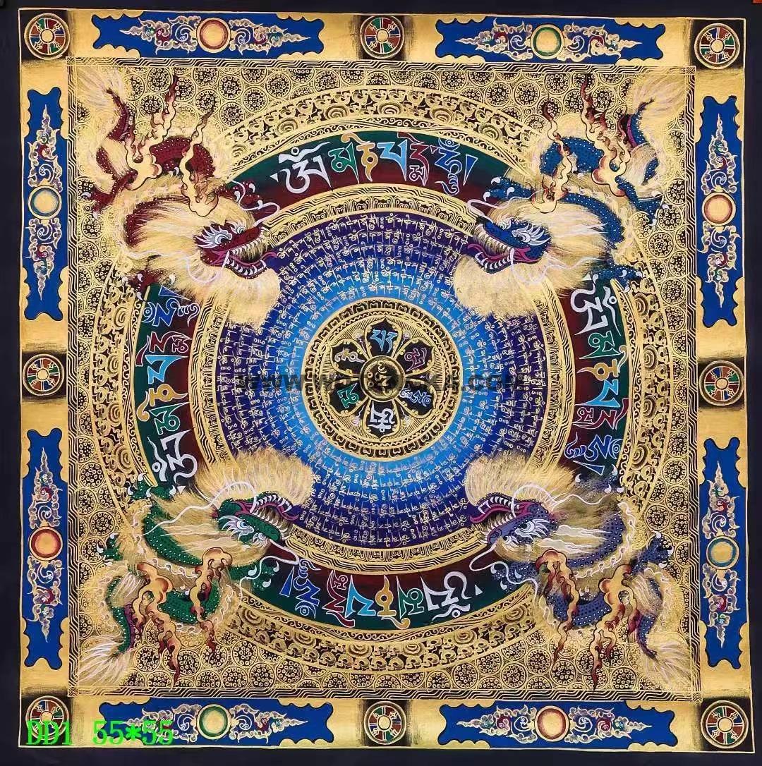 尼泊尔知名唐卡画师亲绘《六字真言龙坛城》,唐卡 画工精美细腻,金线如发丝,晕染和描金相当的完美,难得的高品质精品唐卡。作品采用24K真金描线,天然矿石颜料着色晕染。画工细腻,开脸殊胜,是一副难得一见的好唐卡。