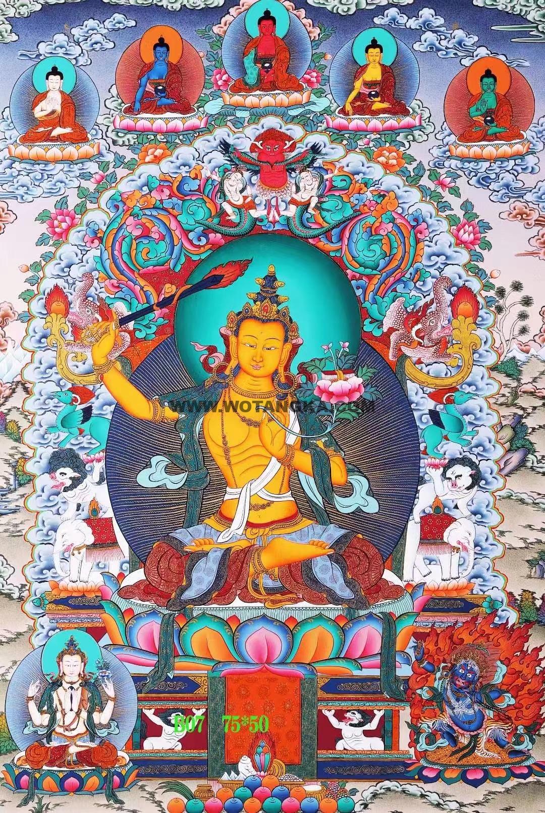 尼泊尔知名唐卡画僧纯手绘布本唐卡【文殊菩萨】,作品采用24K真金金粉混合天然颜料纯手绘而成。作品主尊宝相传神。布图干净精美、画工非常的细腻,严格的遵照佛经的度量仪轨如法绘制,期待有缘人。