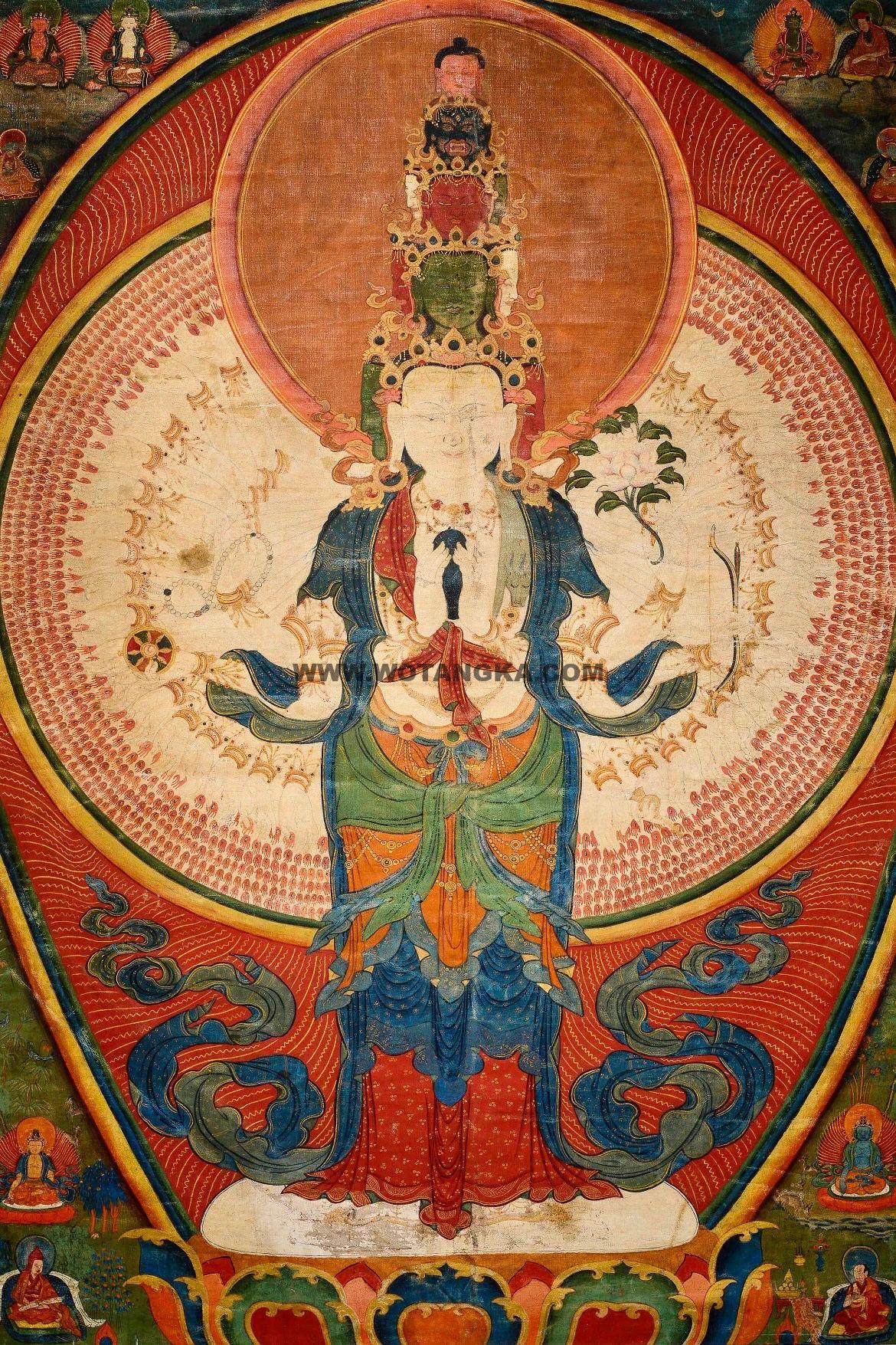 此幅唐卡画面中央菩萨十一面,颜色神情各异的头像分五层呈塔状排列,第四层为愤怒相,最顶层为如来相。主八臂分别持佛珠、法轮、莲花、弓箭、如意宝珠等。上身佩戴璎珞、下身着长裙,长裙上用黄金描绘出图案,真不愧是西藏的王。精美绝伦,细致入微,衣帔艳丽华美。远观此幅唐卡,千手宛如明月当空,皎洁恢宏,非常奇妙,近观却发现明月之中竟有千手千眼,千手从背后层层迭迭铺开,排列整齐,更如如孔雀开屏,美妙动人而又气势恢弘。两侧山峦起伏,景色怡人。天空祥云飘浮,寥廓而高远。