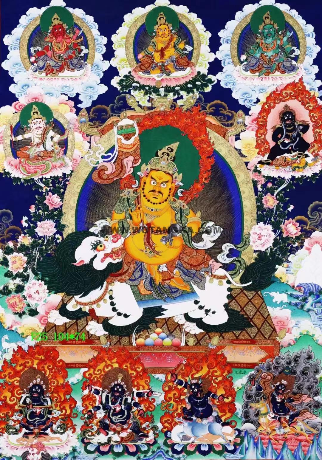 热贡知名画师手绘力作唐卡【财宝天王·五方财神】。作品采用纯金纯矿绘制,24K金描金,作品主尊宝相传神。布图干净精美、画工非常的细腻,严格的遵照佛经的度量仪轨如法绘制,期待有缘人。