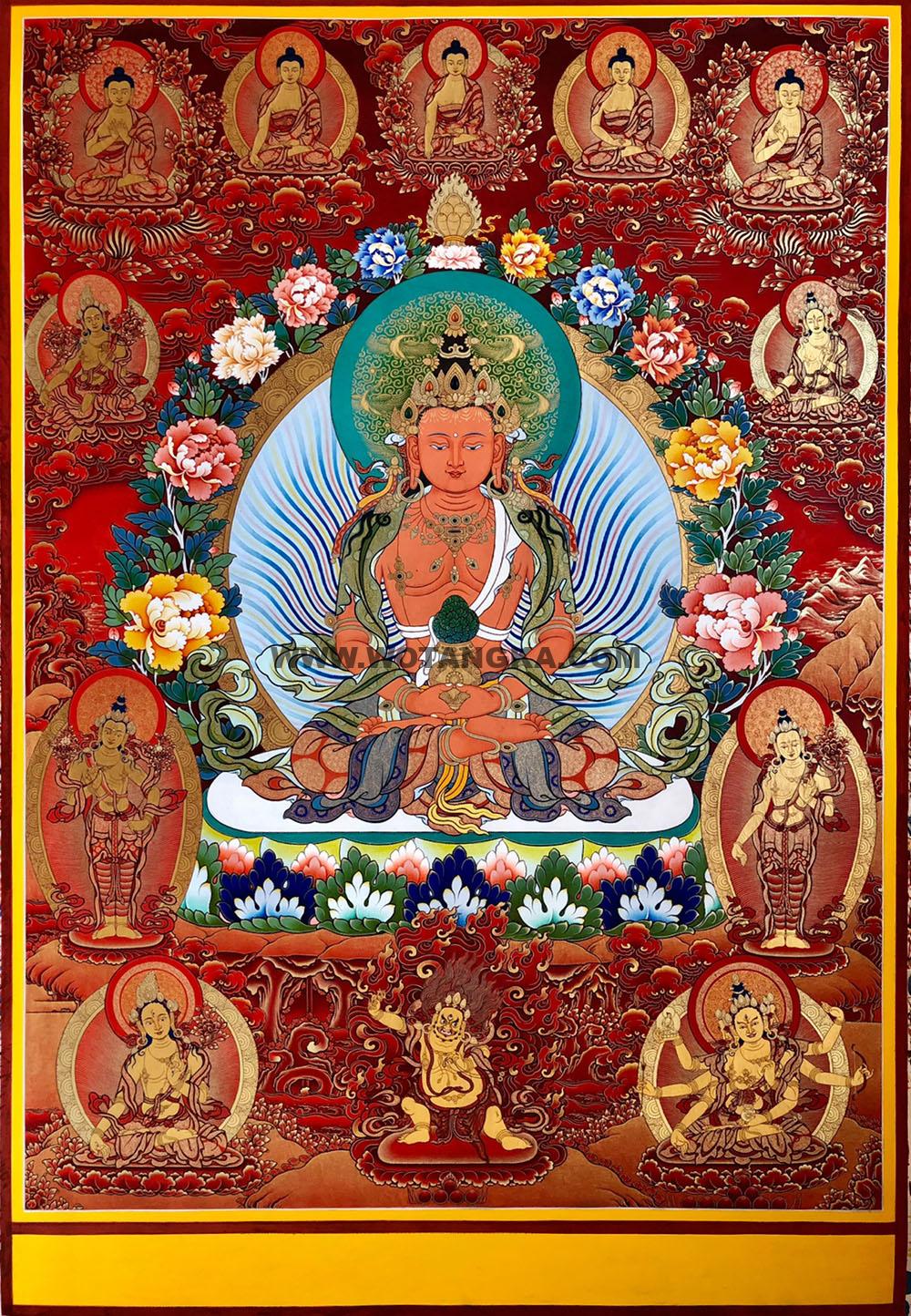 唐卡作品名称:长寿如来五佛吉祥长寿三尊鸿运净土供养图