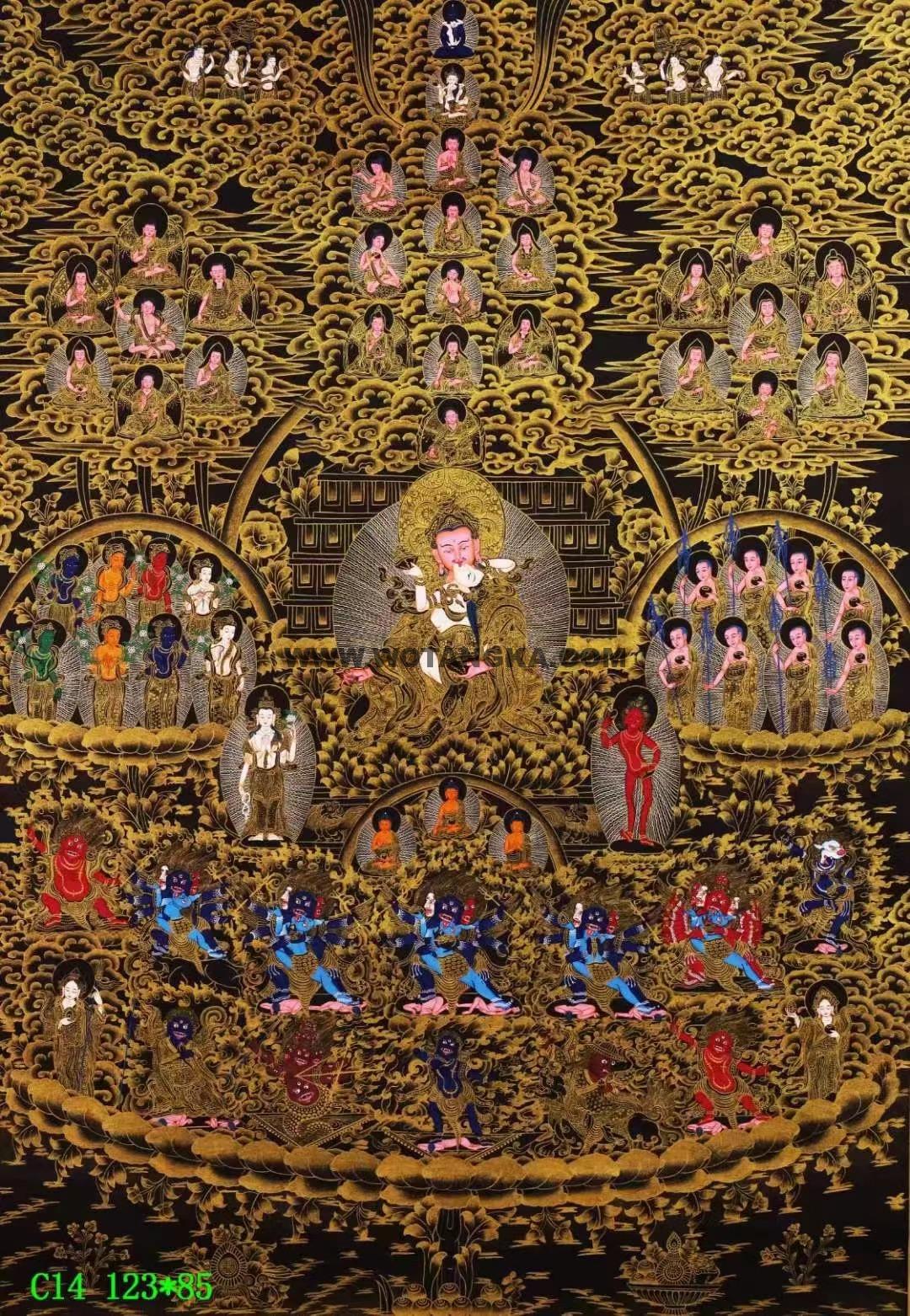 《莲花生大士·宁玛派皈依境》稀有少见,非常珍贵。成名画师亲工手绘制作,主尊开脸慈悲传神,无上殊胜、非常值得收藏。莲花生大士宁玛派皈依境采用24K真金描线,矿石颜料上色完成,绘制周期漫长。