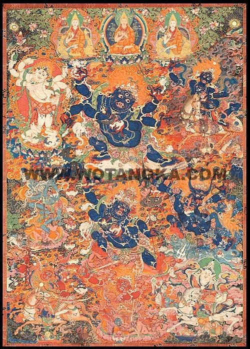画面以六臂大黑天为中心,描绘了格鲁派即为重要的九大愤怒相护法。画中为六臂大黑天、四面大黑天、大红司命主。左上为白六臂大黑天(白如意珍宝怙主),其下为婆罗门护法,大野赞犀甲护法。右上为吉祥天母,其下为阎魔护法,以及居士白毡神。