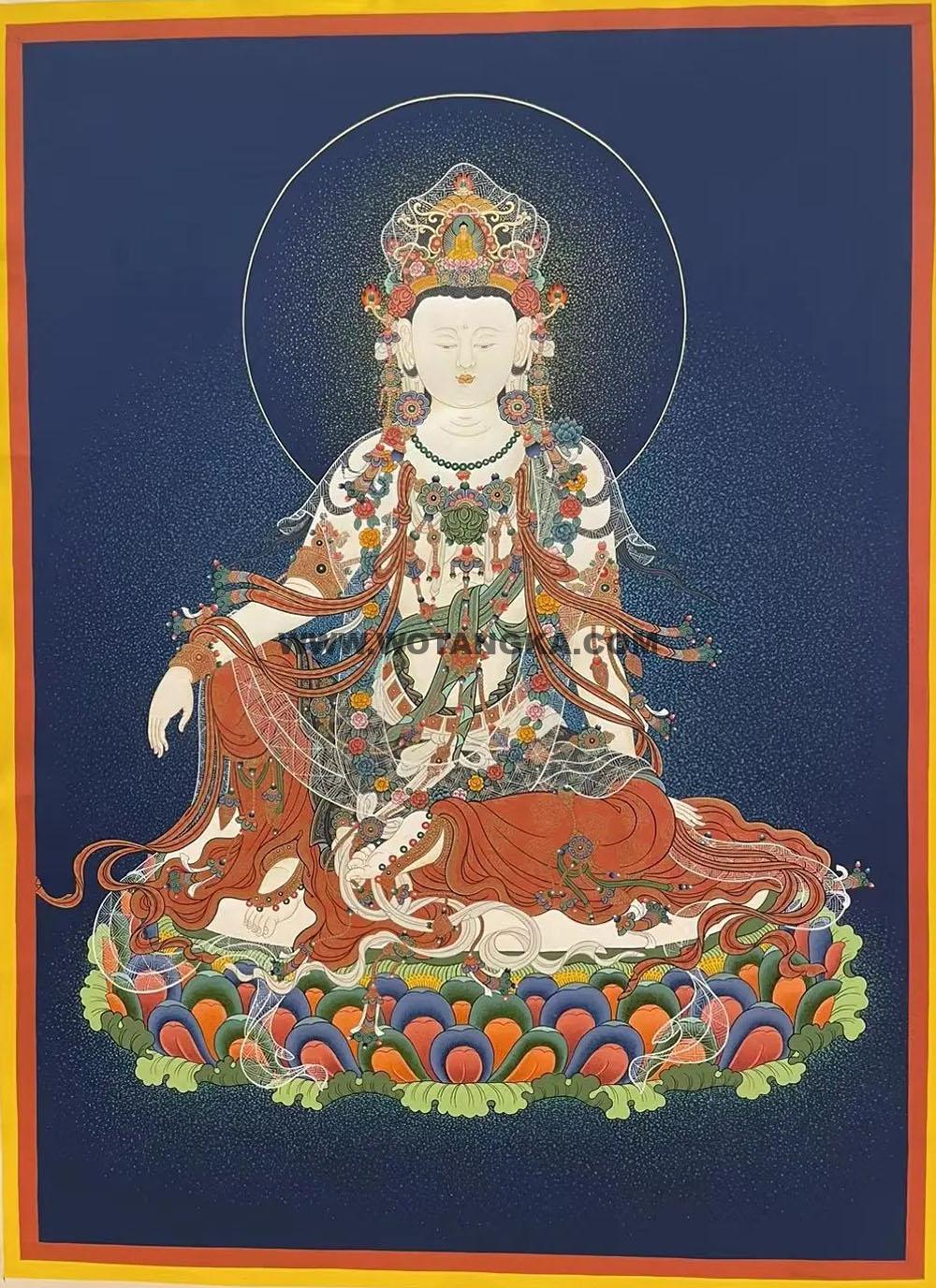 中国唐卡艺术作品中的【大势至菩萨】唐卡手绘布本,热贡知名画师尕藏·画院出品,收藏供奉不要错过。作品主尊宝相传神, 采用天然矿石晕染,纯金描线,画工细腻,殊胜,精美、风格富丽,采用24K真金描绘,画工细腻,开脸殊胜,是一副难得一见的好唐卡作品。