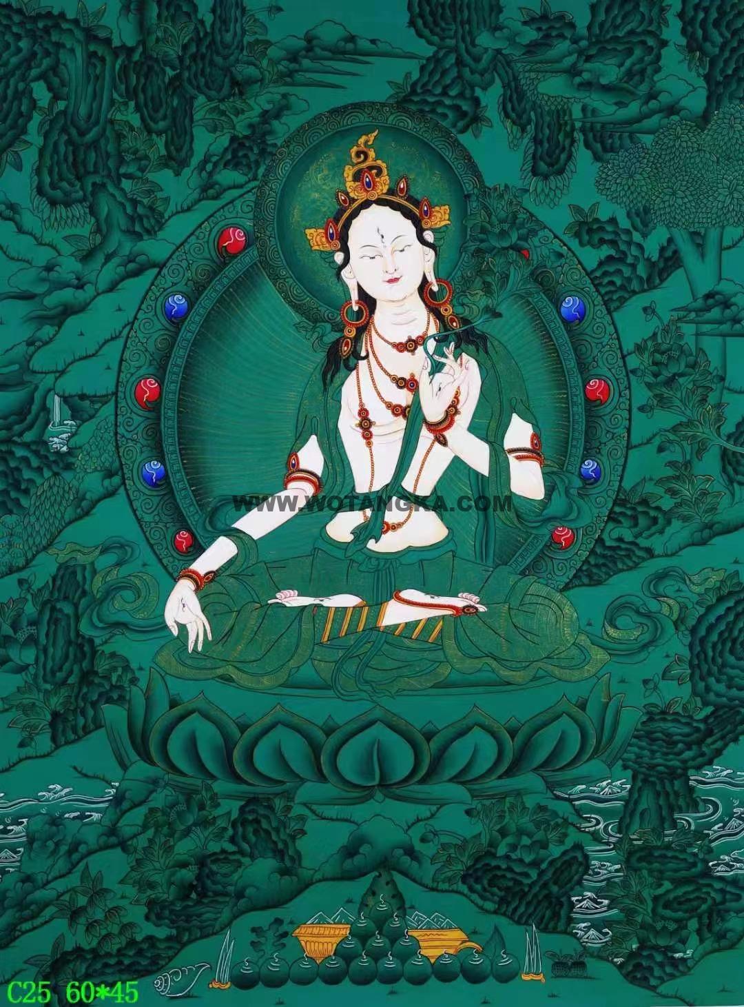 白度母为二十一度母之一,是一切众生尤其是女性的无比圣神,是保佑心想事成,赐寿除障的如意宝。白度母集二十一度母之功德于一身,能消除病痛邪风,妖魔鬼怪等外部之障与贪嗔痴等内部之障,勇猛无比,形随众生,变幻莫测。藏传佛教认为生信者只要一念及,即能以兄弟姐妹之情倾力相助,堪称众女神之王。白度母是能够为一切众生赐予长寿的一尊度母,许多信仰众所知道的白度母是一位赐予众生长寿的本尊,其实不止这些,如果虔诚地修持她的法门,也可以使智慧迅速增长。转化身边不善磁场,驱邪治病,积累福德,平安吉祥!一切圆满!