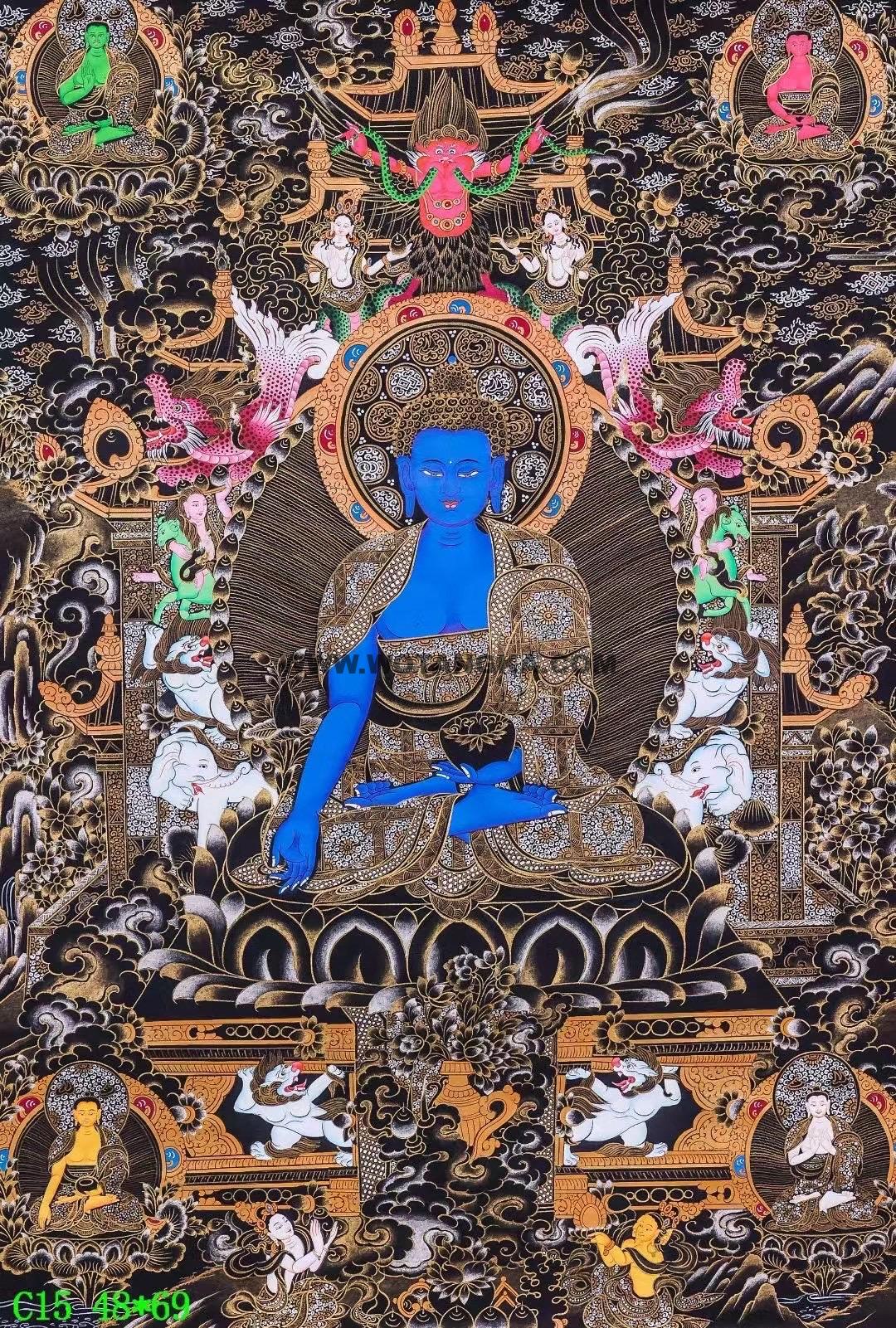 尼泊尔知名唐卡画师作品《药师佛》,作品采用24K真金描线,混合天然颜料纯手绘而成。作品主尊宝相传神,布图干净精美、画工非常的细腻,严格的遵照佛经的度量仪轨如法绘制,期待有缘人。