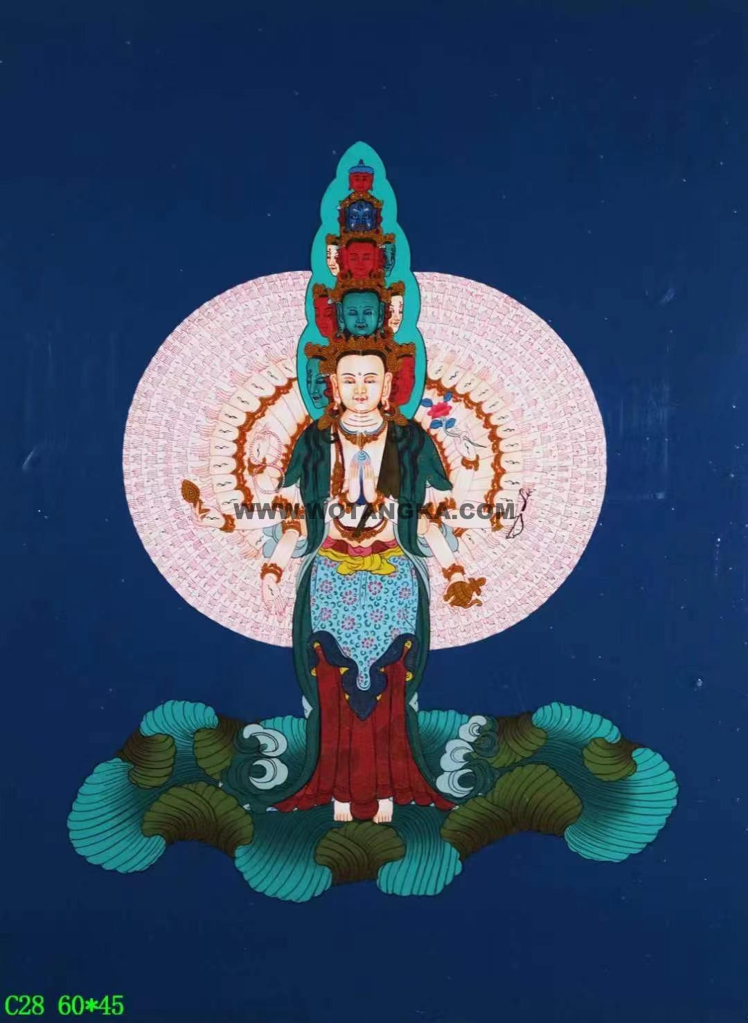 尼泊尔知名唐卡画师作品《千手观音》,作品采用24K真金描线,混合天然颜料纯手绘而成。作品主尊宝相传神,布图干净精美、画工非常的细腻,严格的遵照佛经的度量仪轨如法绘制,期待有缘人。