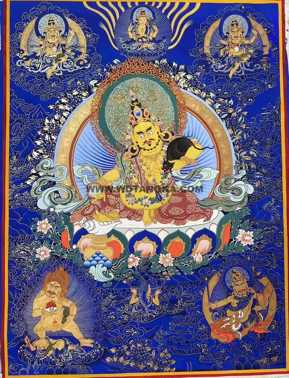 黄财神为北方司财众部之首领,掌无尽宝库,修此法者,可消灭六道穷苦,增长福德、寿命、智慧, 以及一切物质与精神上的受用。心灵上得到满足。黄财神是藏传佛教各大教派普遍供养的五姓财神之一,因其身相黄色,故称黄财神。修持黄财神法、持诵其密咒,可获得黄财神庇佑,能增长福德、寿命、智能、物质及精上之受用,不被生活所逼,以及一切经济压迫,可安心向道。但修法者需发无上菩提心,广结善缘,勤行布施。万勿悭贪成性,护法降罪也. 黄财神面慈目善,头戴宝冠,坦胸露腹,戴着珍宝璎珞、珍宝耳环、珍宝手镯和珍宝足钏,上身穿丝制天衣,下身着丝制裙子,右手于右膝上捧喷焰末尼,左手握着吐宝鼬,以威镇坐姿坐在莲花宝座中央。身后有光环、祥云、远山。能增长福德、寿命、智慧、物质及精神上之受用。主司财富,能使一切众生脱于贫困,财源广进。