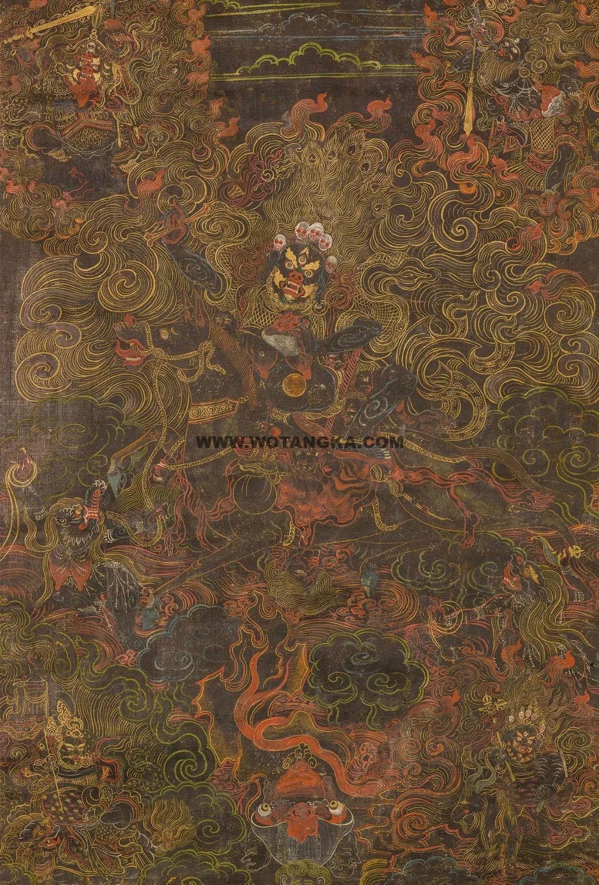 画面天空以深暗浓重的黑色为底色,主尊及其伴神以金汁精心描绘,诸尊火焰末端稍加晕染,画法与着色都非常讲究,尤显狰狞恐怖的气氛,有较高的艺术水准。