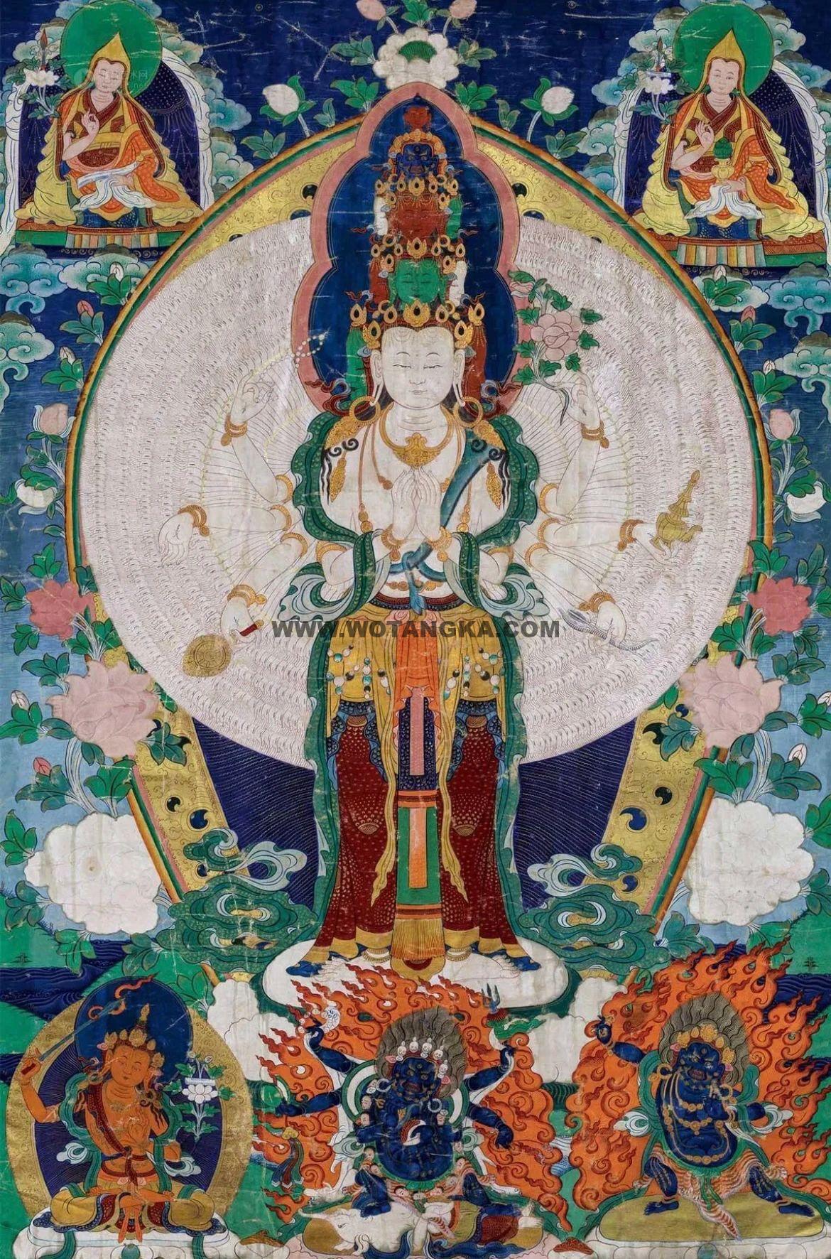 此唐卡主尊为千手千眼观音,为西藏六种观音菩萨之一。