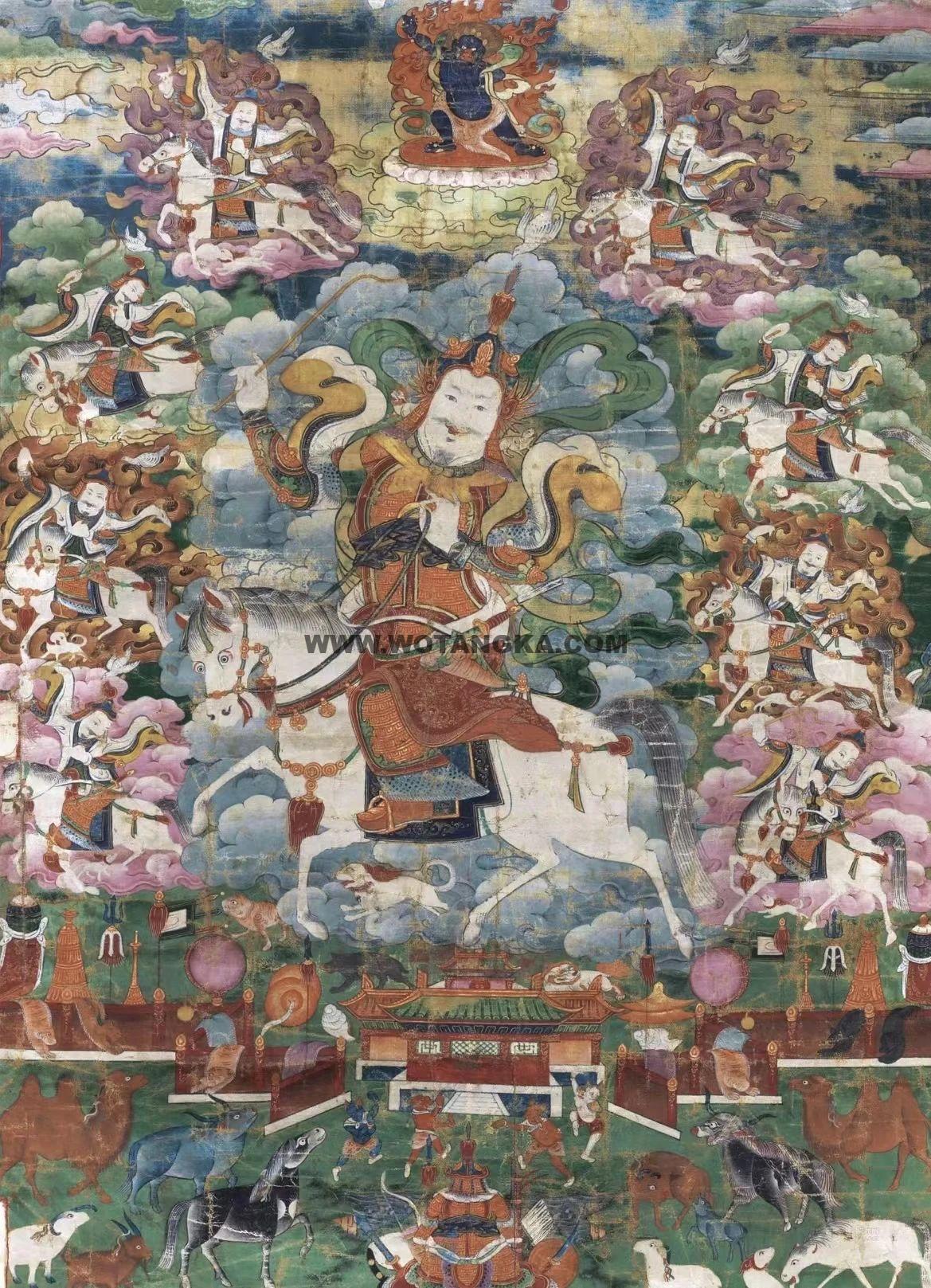 战神又称“敌神”,是专门保护其崇拜者免受敌人伤害,并帮助崇拜者增加财富的一类神灵。藏传佛教崇奉的战神很多,有的来源于印度,如玛哈噶拉等;而大多数来源于西藏苯教,如七战神、九战神、十三战神、二十一战神等。这些来自苯教的战神一般都成组出现,自成一系,形象大多为骑兽,身着盔甲,手持大刀、长矛和旌旗等。因其形象大多相仿,所以要确定一尊具体战神的身份非常困难。
