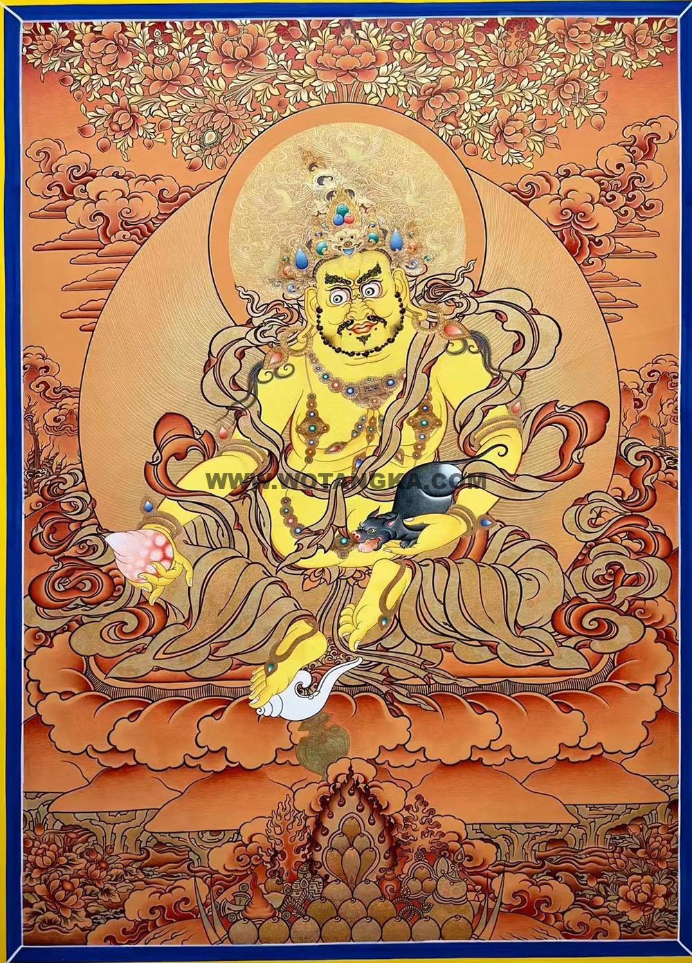黄财神为北方司财众部之首领,掌无尽宝库,修此法者,可消灭六道穷苦,增长福德、寿命、智慧, 以及一切物质与精神上的受用。心灵上得到满足。黄财神是藏传佛教各大教派普遍供养的五姓财神之一,因其身相黄色,故称黄财神。修持黄财神法、持诵其密咒,可获得黄财神庇佑,能增长福德、寿命、智能、物质及精上之受用,不被生活所逼,以及一切经济压迫,可安心向道。但修法者需发无上菩提心,广结善缘,勤行布施。万勿悭贪成性,护法降罪也. 黄财神面慈目善,头戴宝冠,坦胸露腹,戴着珍宝璎珞、珍宝耳环、珍宝手镯和珍宝足钏,上身穿丝制天衣,下身着丝制裙子,右手于右膝上捧喷焰末尼,左手握着吐宝鼬,以威镇坐姿坐在莲花宝座中央。身后有光环、祥云、远山。能增长福德、寿命、智慧、物质及精神上之受用。主司财富,能使一切众生脱于贫困,财源广进。