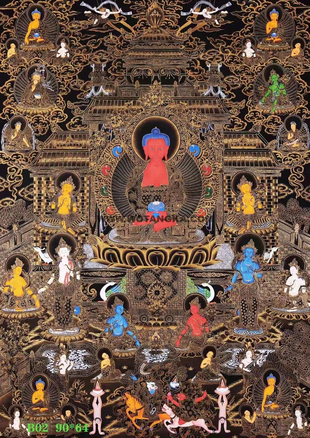 尼泊尔画师力作【阿弥陀佛】作品采用金粉混合矿物颜料纯手绘而成。作品主尊宝相传神,布图精美、画工非常的细腻,严格的遵照佛经的度量仪轨如法绘制,期待有缘人。