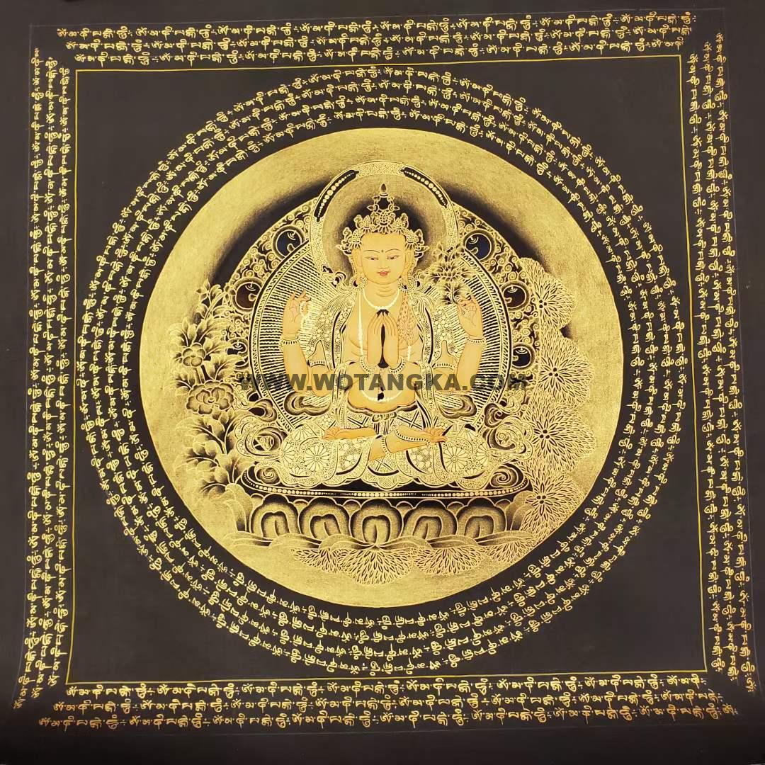 尼泊尔成名画师手绘力作,纯手绘布本唐卡【四臂观音坛城】,作品采用24K真金金粉混合天然颜料纯手绘而成。作品主尊宝相传神。布图干净精美、画工非常的细腻,严格的遵照佛经的度量仪轨如法绘制,期待有缘人。