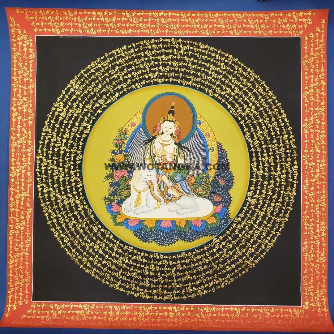 尼泊尔成名画师手绘力作,纯手绘布本唐卡【普贤菩萨坛城】,作品采用24K真金金粉混合天然颜料纯手绘而成。作品主尊宝相传神。布图干净精美、画工非常的细腻,严格的遵照佛经的度量仪轨如法绘制,期待有缘人。