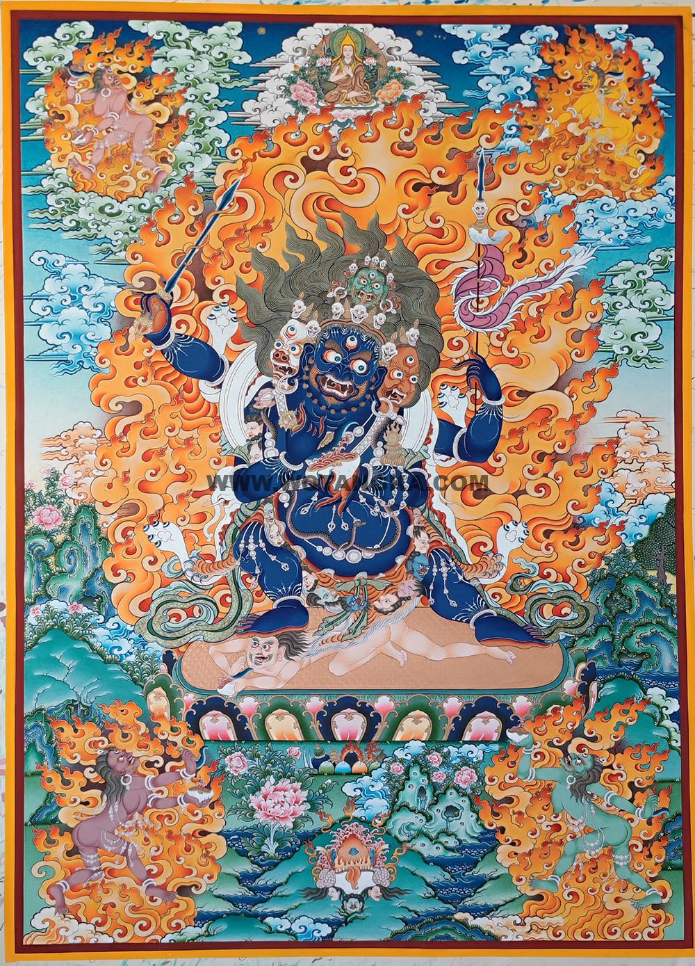 四臂玛哈嘎拉,身黑蓝色,一面四臂,三目圆睁赤红,发如劫火上扬,须眉似焰炽然,头戴五骷髅冠,有半金刚杵及蛇饰,以鲜血人首作颈链,蛇饰骨饰为身庄严,下著虎皮裙。雄姿焕发,英勇威猛,以如意坐姿,住於莲花日轮尸座之上,四周烈焰如劫火燃盛。