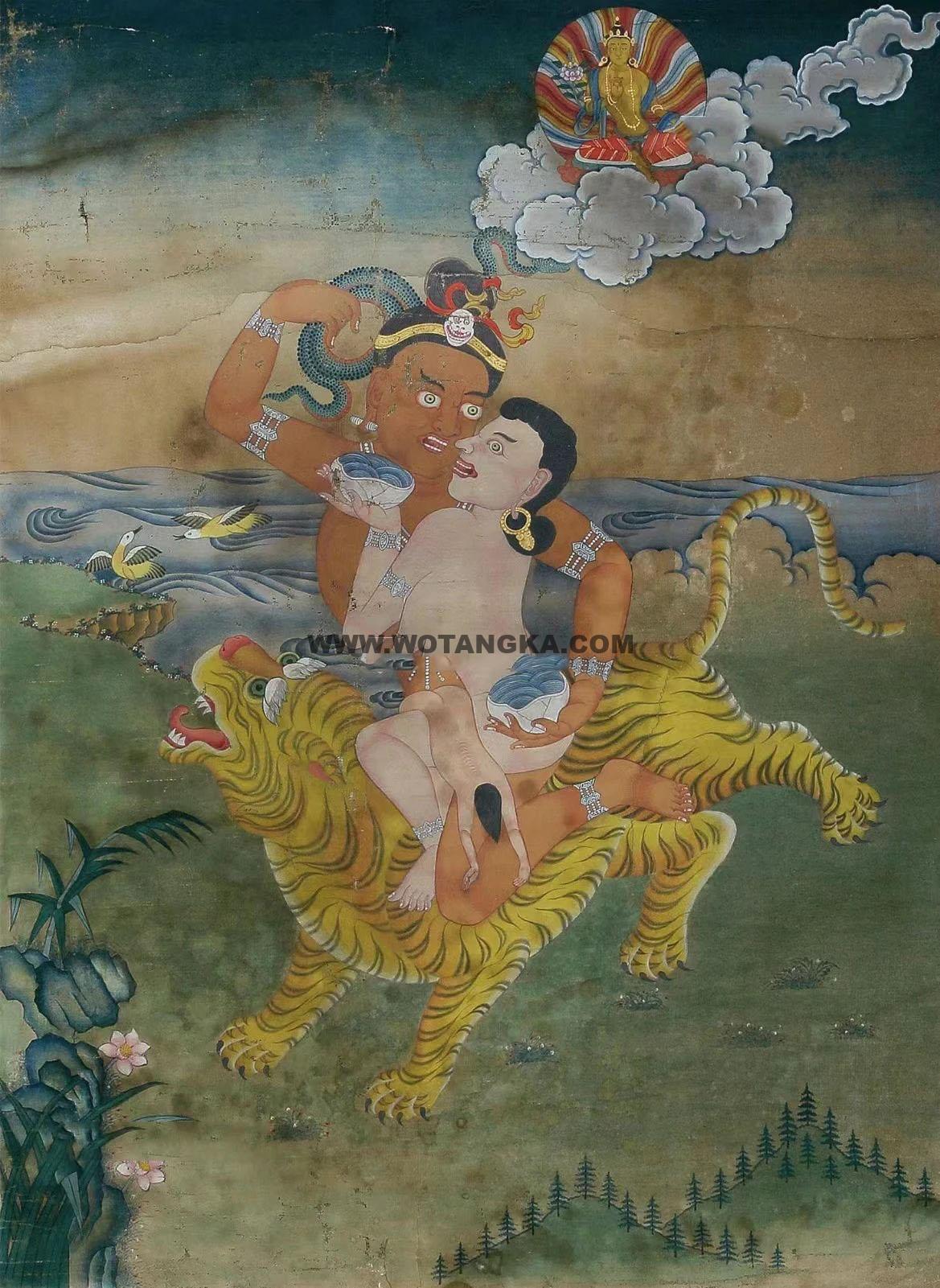 画面表现了咕噜东比巴大师的故事。在古印度名叫马加达的地方,东比巴大师曾经是国王。骑在母老虎身上,手持着毒蛇作为皮鞭,是国王和皇后两人得到了喜金刚成就后,从森林中走出来见国民的场景。