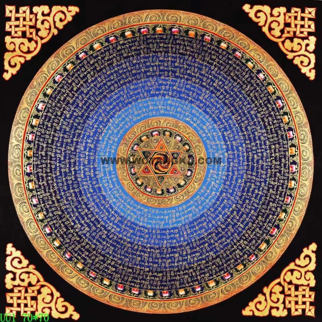 坛城象征宇宙本源,是圣坛的代表,挂与家里玄关之处,有镇宅辟邪的妖邪不入的作用,古代著名寺院皇宫都用此法门来镇宅辟邪,十分殊胜。喜欢不要错过。六字大明咒是观世音菩萨心咒,源于梵文中,此咒含有诸佛无尽的加持与慈悲,是诸佛慈悲和智慧的音声显现。能改变命运,修成幸福健康的人生。