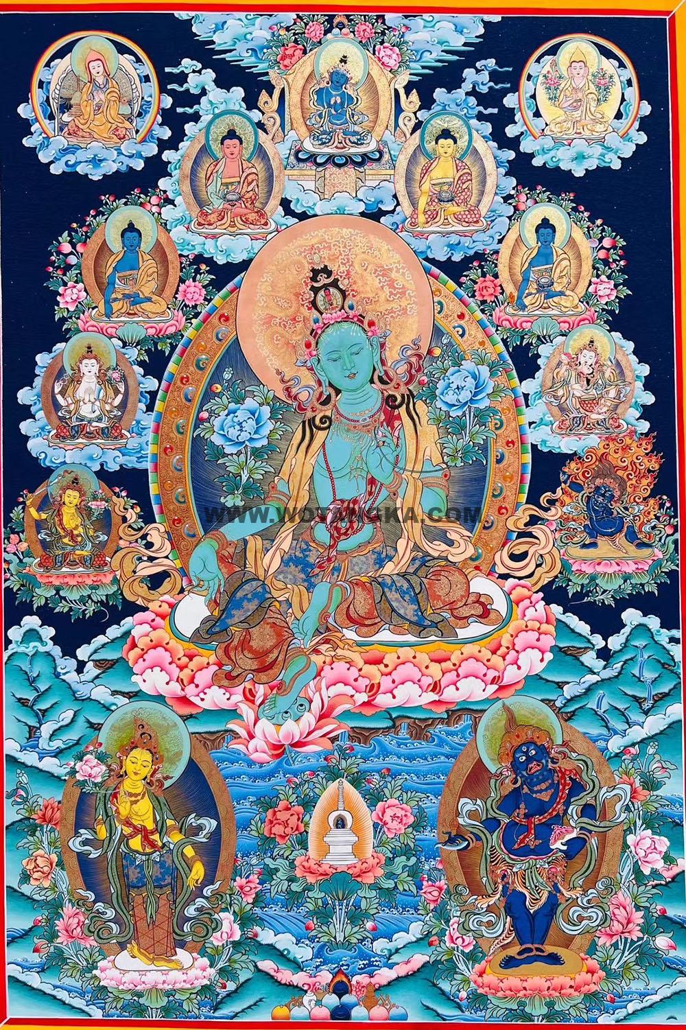 唐卡作品名称:绿度母诸天佛菩萨荟吉祥供养图