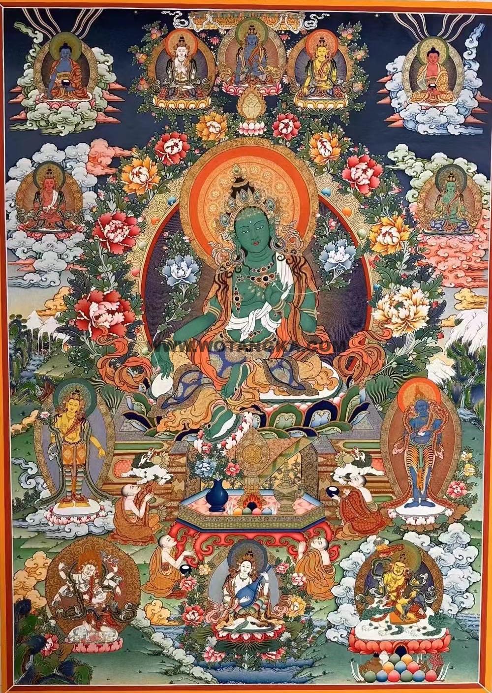 中国唐卡艺术作品中的【绿度母】唐卡手绘布本,热贡知名画师东智加·画院出品,收藏供奉不要错过。作品主尊宝相传神, 采用天然矿石晕染,纯金描线,画工细腻,殊胜,精美、风格富丽,采用24K真金描绘,画工细腻,开脸殊胜,是一副难得一见的好唐卡作品。