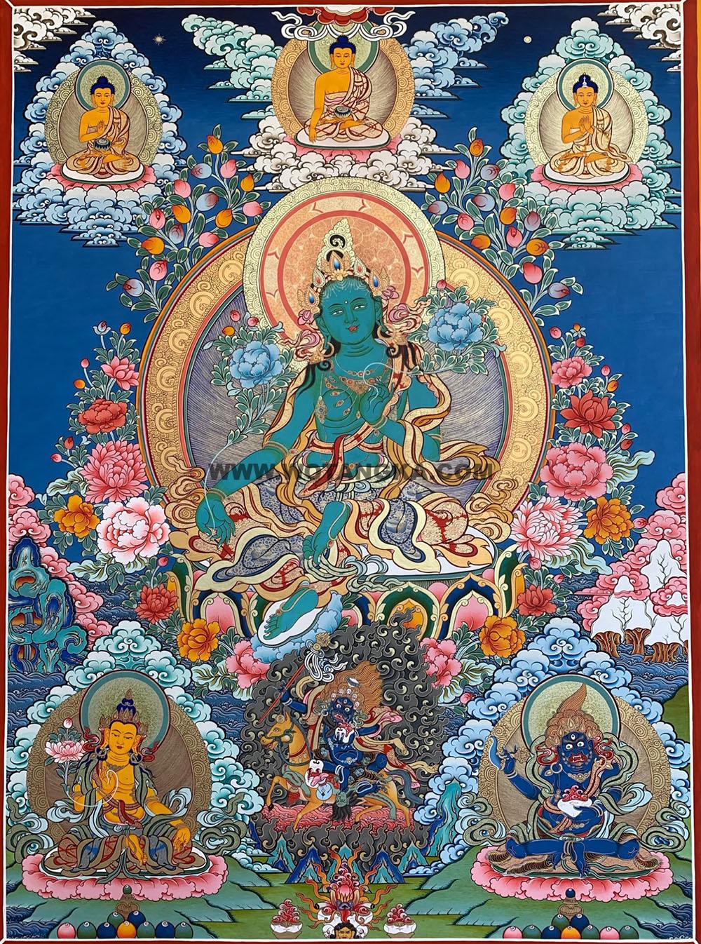 绿度母,梵名Tara,全称圣救度佛母。度母有许多不同的化现,包括有二一度母、五百度母等等,皆为观世音菩萨之化身。相传绿度母是由观世音菩萨的眼泪所化现,为所有度母之主尊,总摄其余二十尊化身之所有功德,是慈悲与绝美的象征。