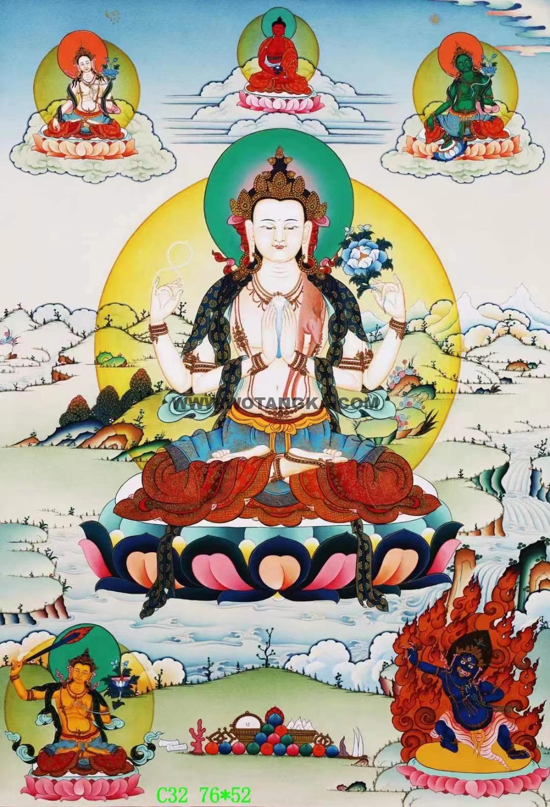 尼泊尔知名唐卡画师纯手绘布本唐卡【四臂观音·三怙主】,作品采用24K真金金粉混合天然颜料纯手绘而成。作品主尊宝相传神。布图干净精美、画工非常的细腻,严格的遵照佛经的度量仪轨如法绘制,期待有缘人。