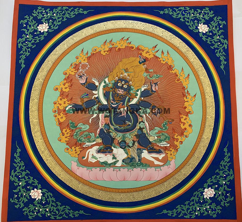 玛哈嘎拉是梵语,译为大黑天,即”怙主”之意,为上师、本尊、护法三根本之护法神,是佛教三根本的化身。其为调伏刚强众生而呈现忿怒相,本尊及眷属护法众除护持佛法外,依缘起多示现为两臂、四臂、六臂黑、白等形象,为藏传佛教诸宗共同推崇的智慧护法,是藏传佛教中最重要的护法神之一。