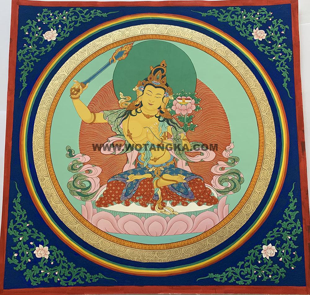 中国唐卡艺术作品中的【文殊菩萨】唐卡手绘布本,热贡知名画师多吉仁青·画院出品,收藏供奉不要错过。作品主尊宝相传神, 采用天然矿石晕染,纯金描线,画工细腻,殊胜,精美、风格富丽,采用24K真金描绘,画工细腻,开脸殊胜,是一副难得一见的好唐卡作品。