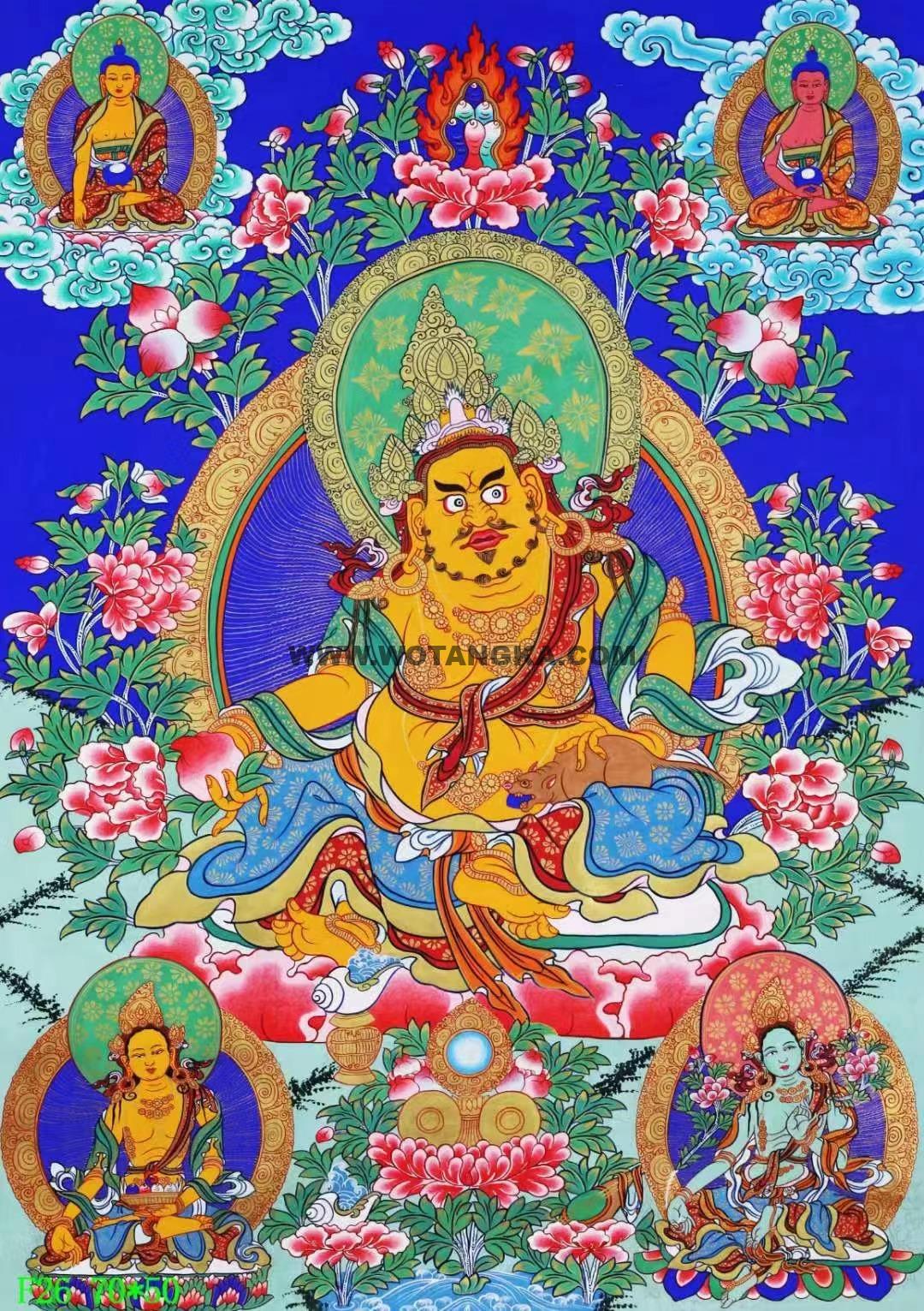 黄财神是藏传佛教各大教派普遍供养的五姓财神之一,因其身相黄色,故称黄财神。修持黄财神法、持诵其密咒,可获得黄财神庇佑,能增长福德、寿命、智能、物质及精上之受用,不被生活所逼,以及一切经济压迫,可安心向道。但修法者需发无上菩提心,广结善缘,勤行布施。万勿悭贪成性,护法降罪也. 黄财神面慈目善,头戴宝冠,坦胸露腹,戴着珍宝璎珞、珍宝耳环、珍宝手镯和珍宝足钏,上身穿丝制天衣,下身着丝制裙子,右手于右膝上捧喷焰末尼,左手握着吐宝鼬,以威镇坐姿坐在莲花宝座中央。身后有光环、祥云、远山。能增长福德、寿命、智慧、物质及精神上之受用。主司财富,能使一切众生脱于贫困,财源广进。