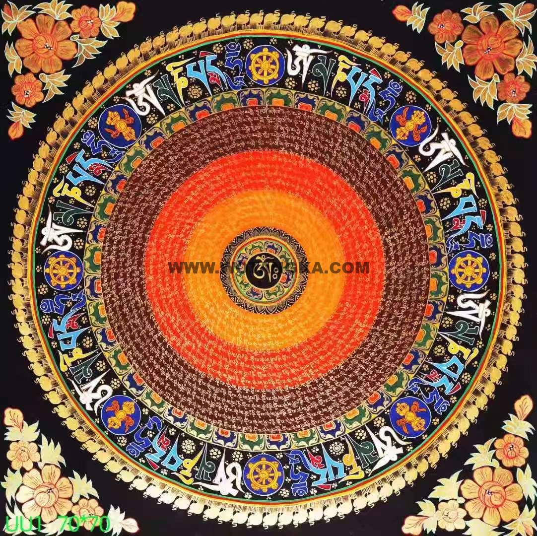 吉祥八宝六字真言经文坛城唐卡 【吉祥八宝坛城】曼陀罗,唐卡手绘布本。作品采用金粉混合天然颜料纯手绘而成,画工细腻,精致,精品不要错过。