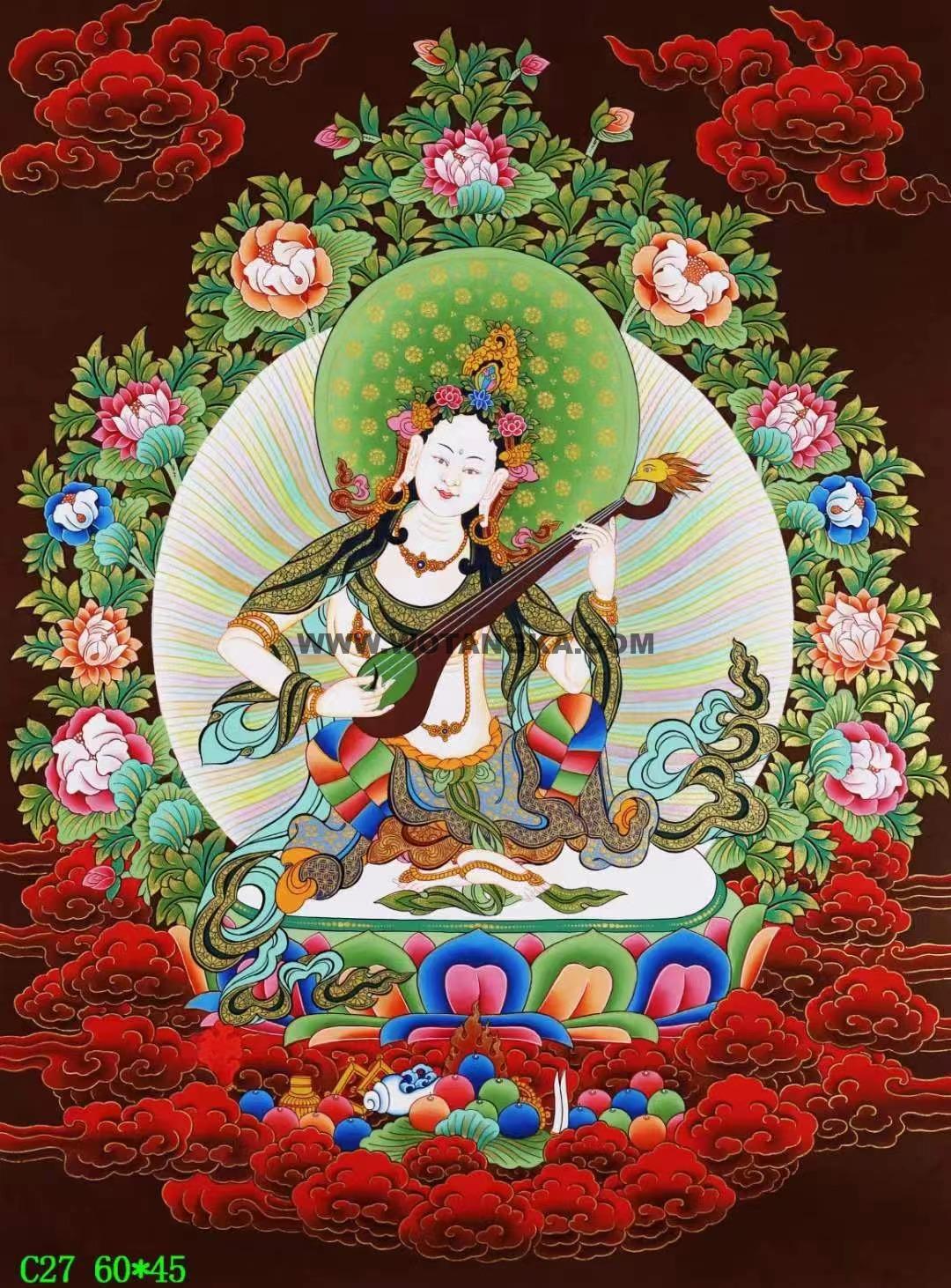 尼泊尔精品手绘唐卡-【妙音天女】作品采用金粉混合矿物颜料纯手绘而成。作品主尊宝相传神,布图精美、画工非常的细腻。