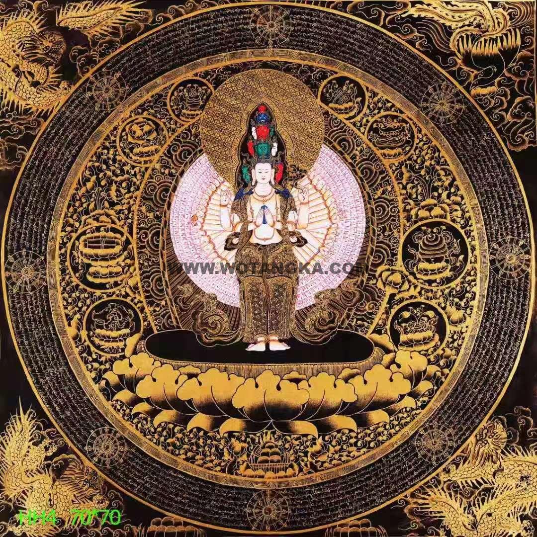 尼泊尔国宝级知名画僧那噶王亲绘,尼泊尔精品唐卡《千手观音》。唐卡手绘布本。采用18K金描线,天然矿石颜料着色晕染。画工细腻,开脸殊胜,是一副难得一见的好唐卡。