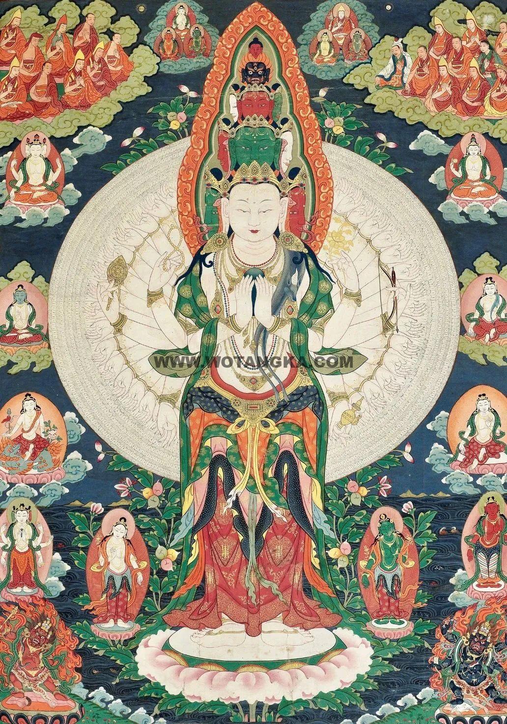 在此幅唐卡中,观音十一面分为五层,最上一层为阿弥陀佛头像,寓意观音菩萨的宗教归属。其下一层为观音降魔时的忿怒化现,其下三层分为喜、怒、嗔三种面貌,展现出救度不同众生的慈悲容颜。上身肩搭帔帛,帔帛绕两臂而下,流畅圆转。正面双手合十,右边三手分别持念珠、法轮、施无畏印;左边三手执莲花、弓箭、净水瓶。下身着长裙,以立姿站于被莲茎托起的莲花之上。主尊上方五佛端坐于祥云之中,两侧有众多格鲁派传承大师环绕。主尊左右为观音菩萨的众多变化身,下方有马头明王和六臂大黑天怒相神灵。