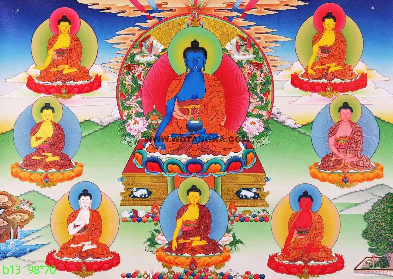 药师佛全称药师琉璃光如来,也有人称大医王佛、医王善逝或消灾延寿药师佛,为东方琉璃净土的教主。为药师本用以比喻能治众生贪、瞋、痴的医师。在中国佛教一般用以祈求消灾延寿。七佛药师即七尊药师。又作七躬医王。藏历初八,药师佛节日。药师七佛住于东方去此四恒河沙乃至十恒河沙世界,曾发大弘誓愿要救拔五浊恶世众生苦恼。佛陀的悲愿无量无边,七佛之弘深本愿不可言尽。