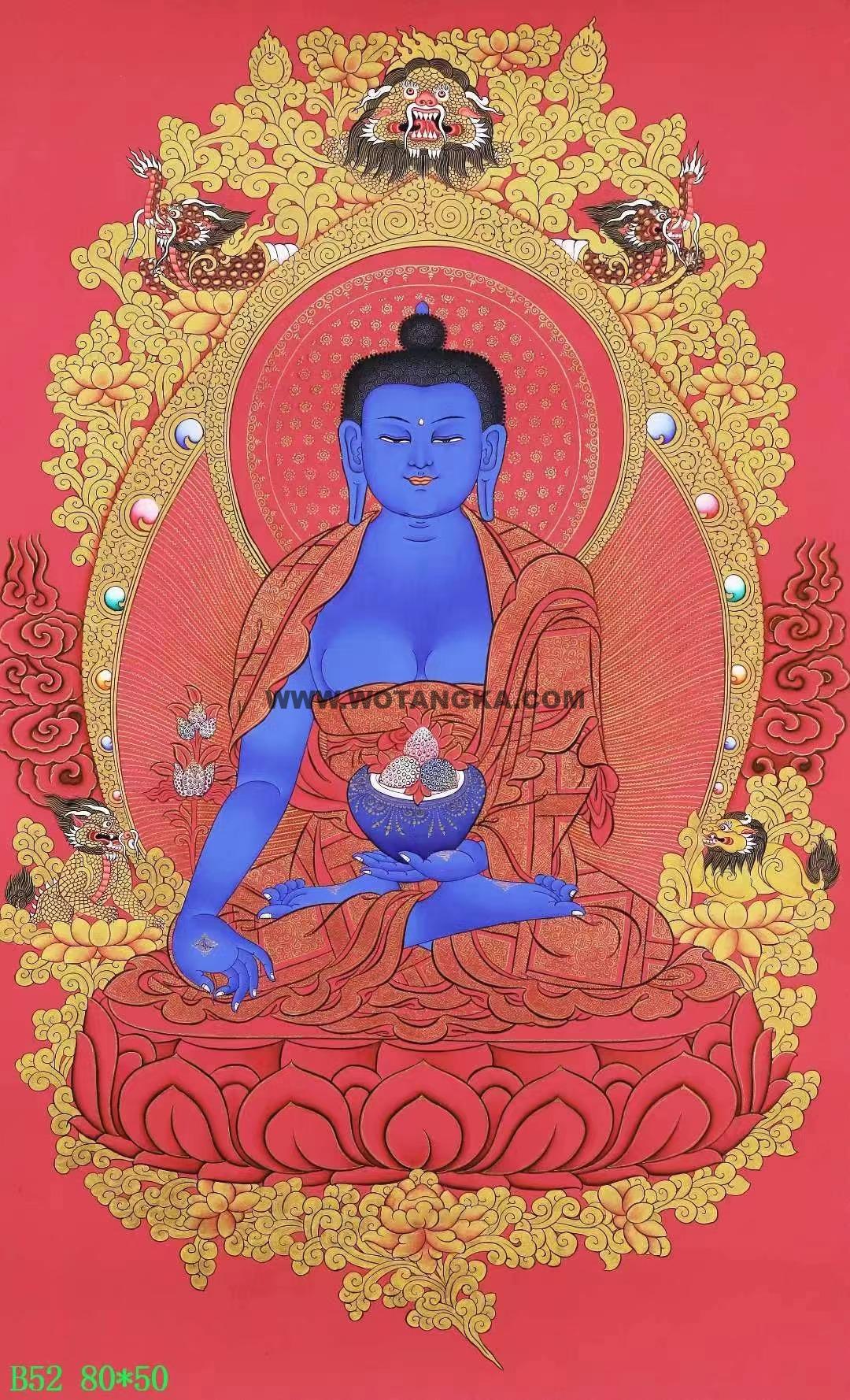 尼泊尔知名唐卡画师作品《药师佛》,作品采用24K真金描线,混合天然颜料纯手绘而成。作品主尊宝相传神,布图干净精美、画工非常的细腻,严格的遵照佛经的度量仪轨如法绘制,期待有缘人。