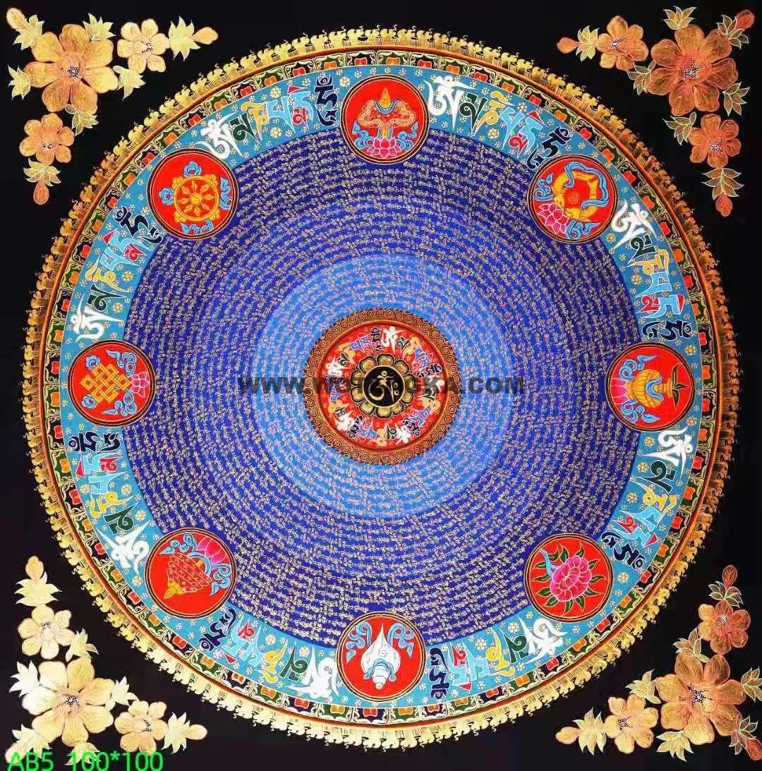 吉祥八宝六字真言经文坛城唐卡 【吉祥八宝坛城】曼陀罗,唐卡手绘布本。作品采用金粉混合天然颜料纯手绘而成,画工细腻,精致,精品不要错过。