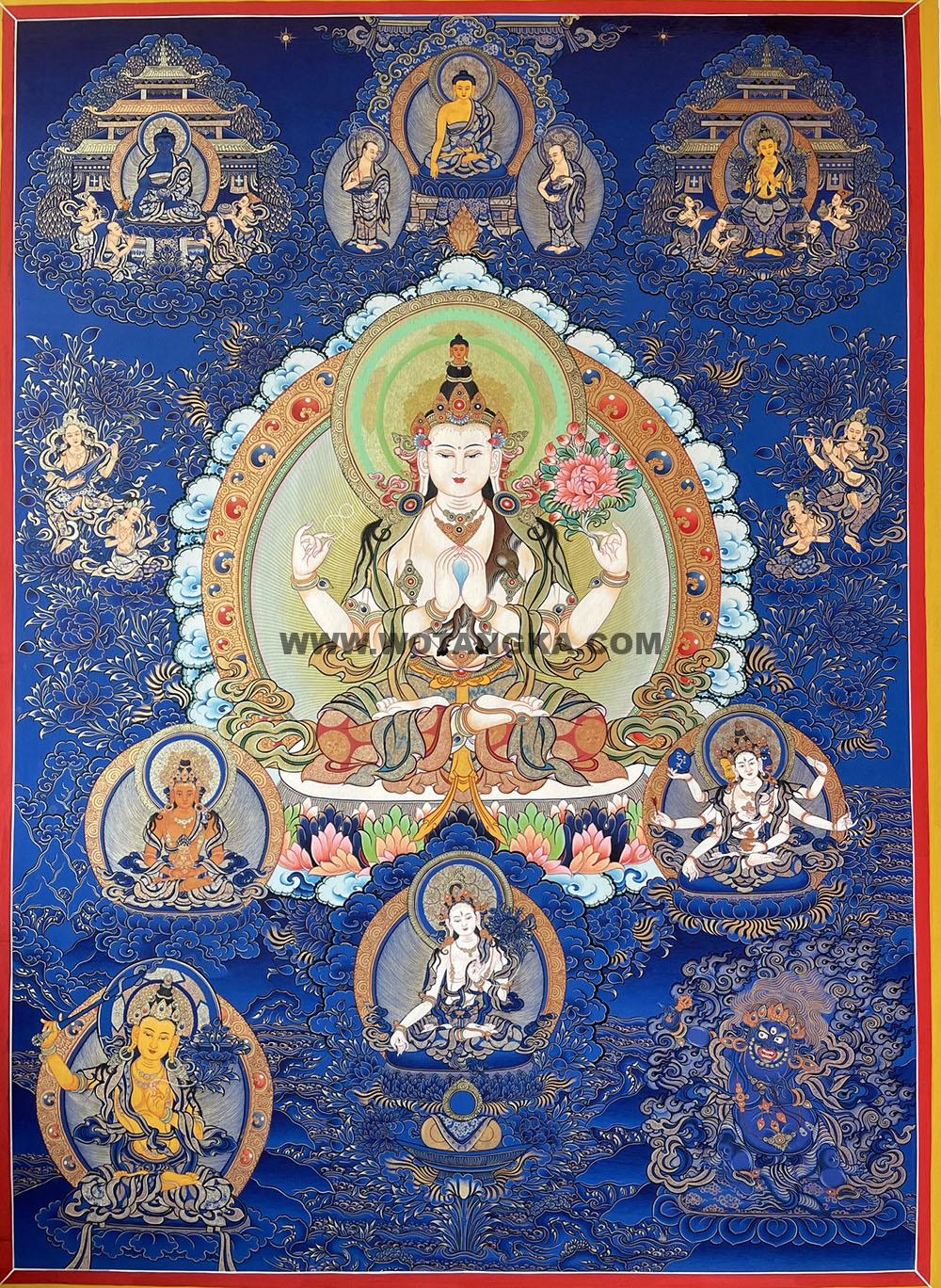 编号188-815171:蓝金唐卡-四臂观音·三怙主(100*70CM左右)