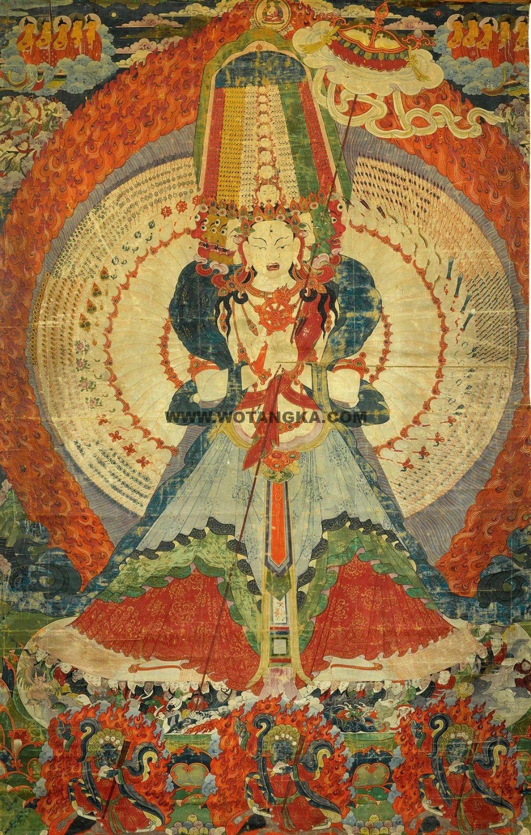 主尊居于中央,身色如白海螺。主面之上有层层相叠的头(竖50,横20),形成塔状,各头均具三目。身体两侧皆为手臂,呈扇形分布,数不胜数,以两面扇形向两侧平铺。各手皆持有法器,其中两只主臂置于胸前,右手持法轮,左手持白伞盖,千手持转轮、金刚杵、利剑、莲花、羯磨杵各二百。上身披蓝绿色帔帛,搭扣系于胸前,红色络腋自颈后顺双臂绕自身前搭扣,下身着绿罩红裙。足下聚满六道众生,表示六道众生皆能得到他的庇护。